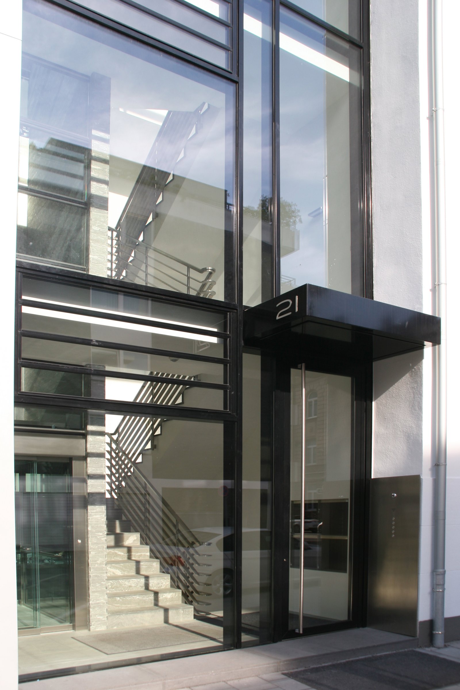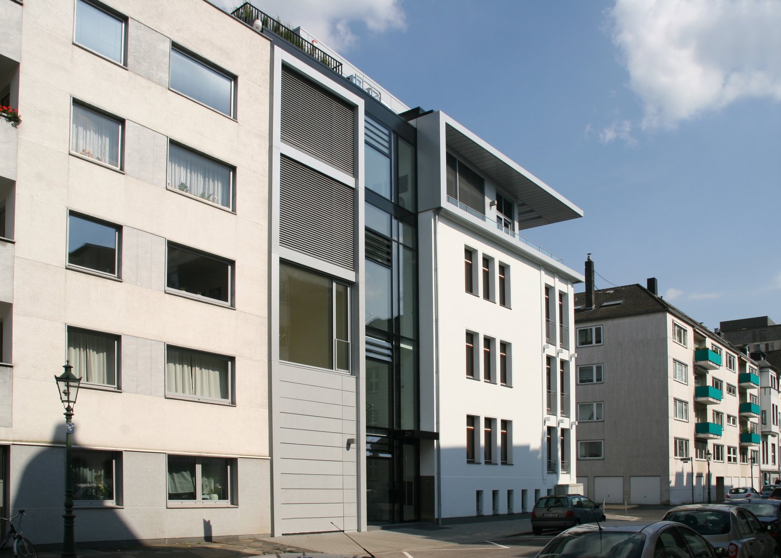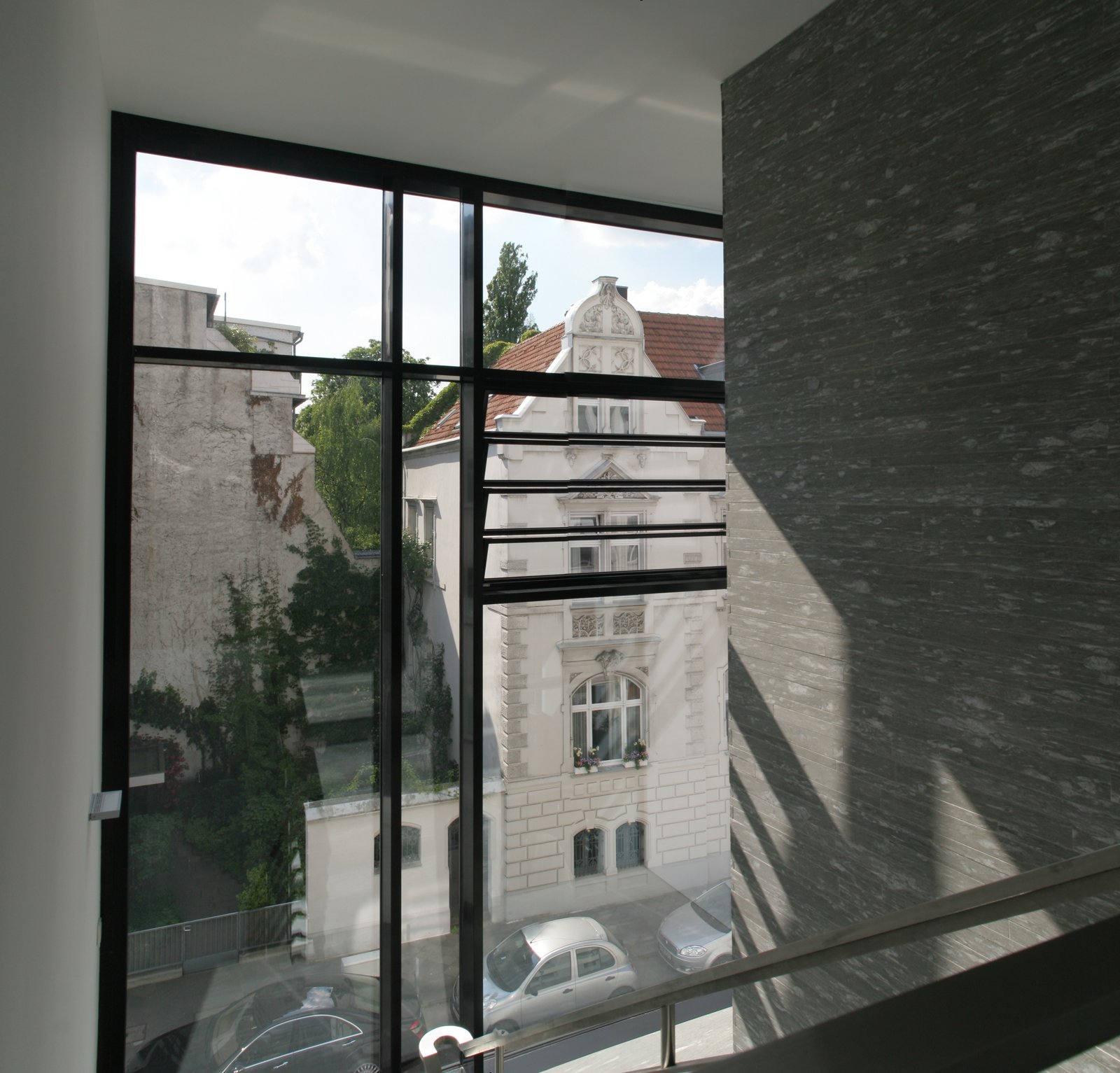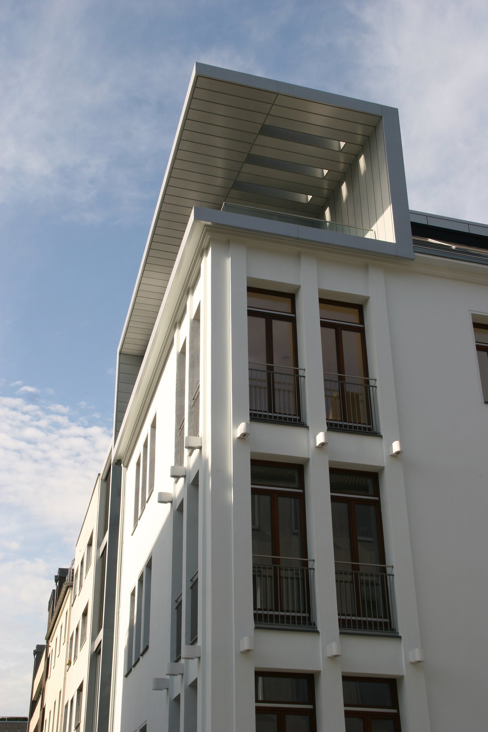 In den unteren drei Geschossen entstanden moderne Büroflächen, untergebracht im Altbauteil des Gebäudes. Der Neubau nimmt den vollflächig verglasten Treppenraum sowie alle Sanitär- und Technikräume auf. Im 3. Obergeschoss und Dachgeschoss entstand eine weitläufige Penthouse-Wohnung.