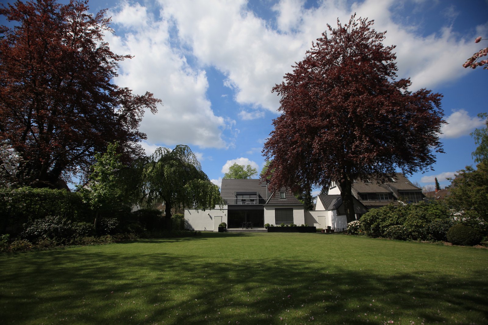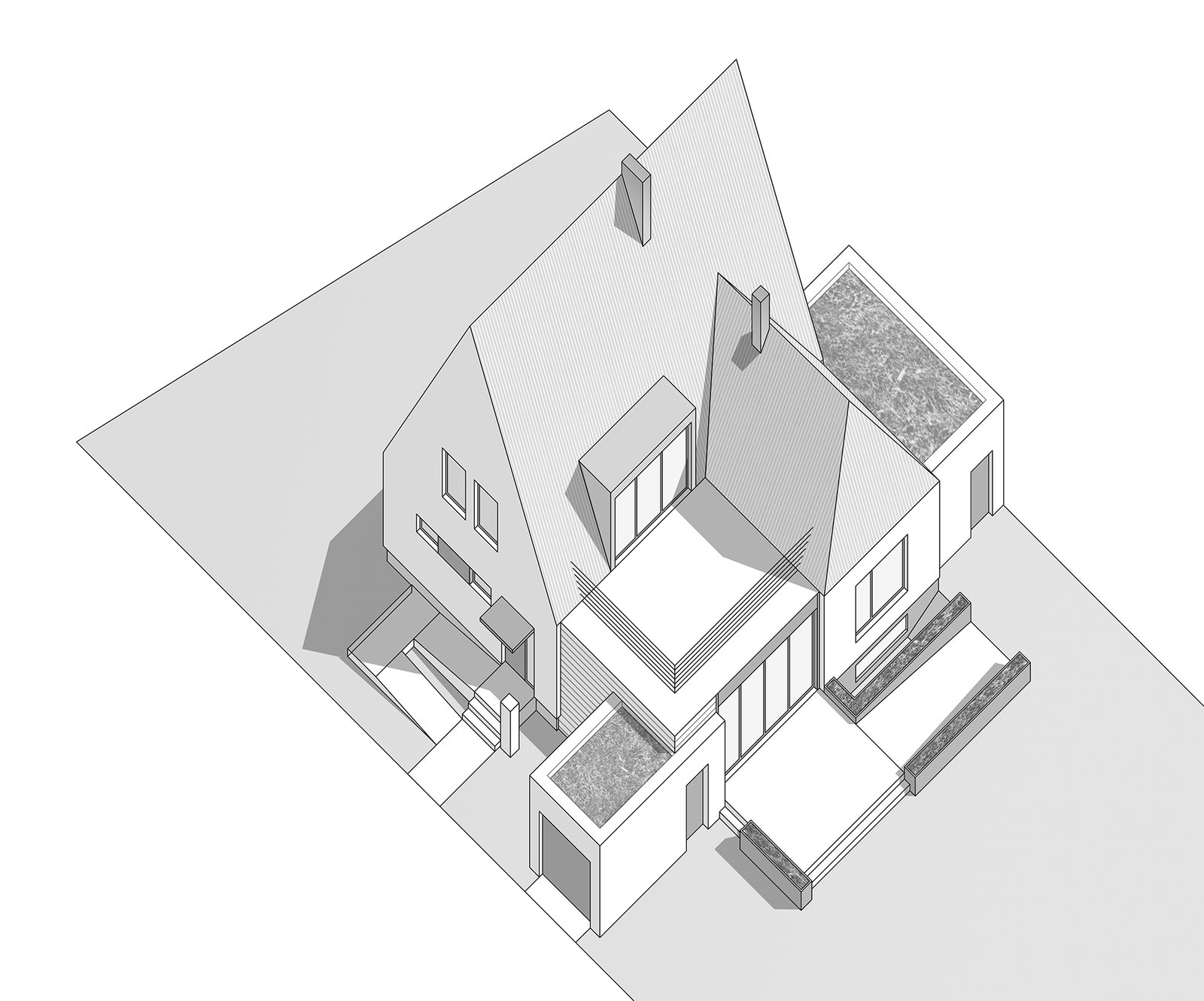 Ziel der Umbaumaßnahmen war die Erweiterung des Gebäudes zugunsten einer größeren Wohnfläche sowie eine barrierefreie Nutzung des Erdgeschosses. Daher wurde gartenseitig ein Baukörper ergänzt, der einen großzügigen Wohnraum aufnimmt. Außerdem wurde das Gebäude um eine zweite Garage und Terrassen erweitert. Dank einer weiteren Gaube konnte auch das Dachgeschoss großzügig ausgebaut werden. Neu ist dort die Dachterrasse oberhalb des neuen Anbaus.