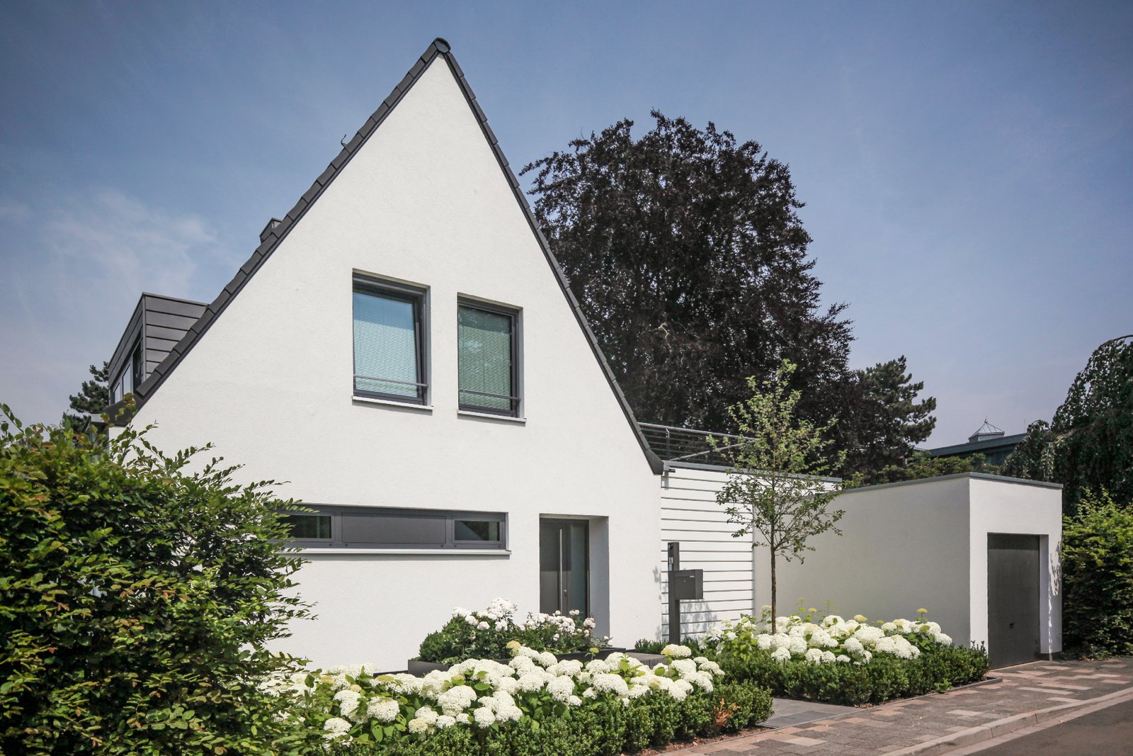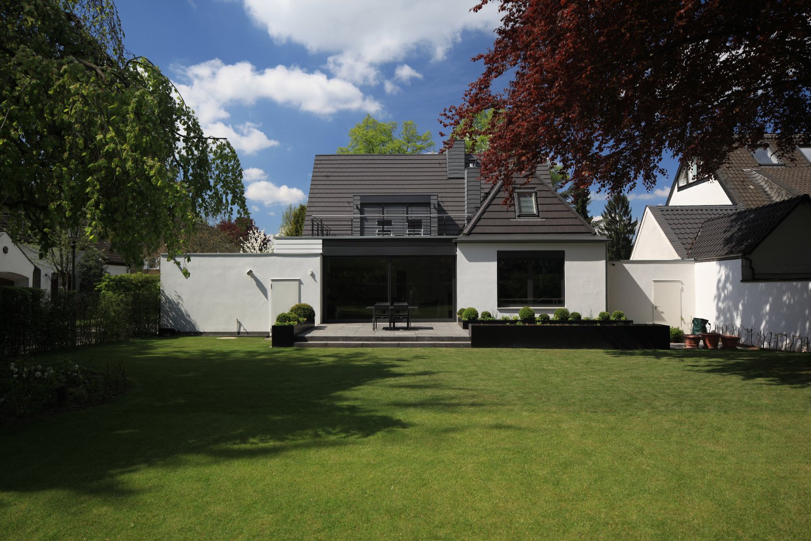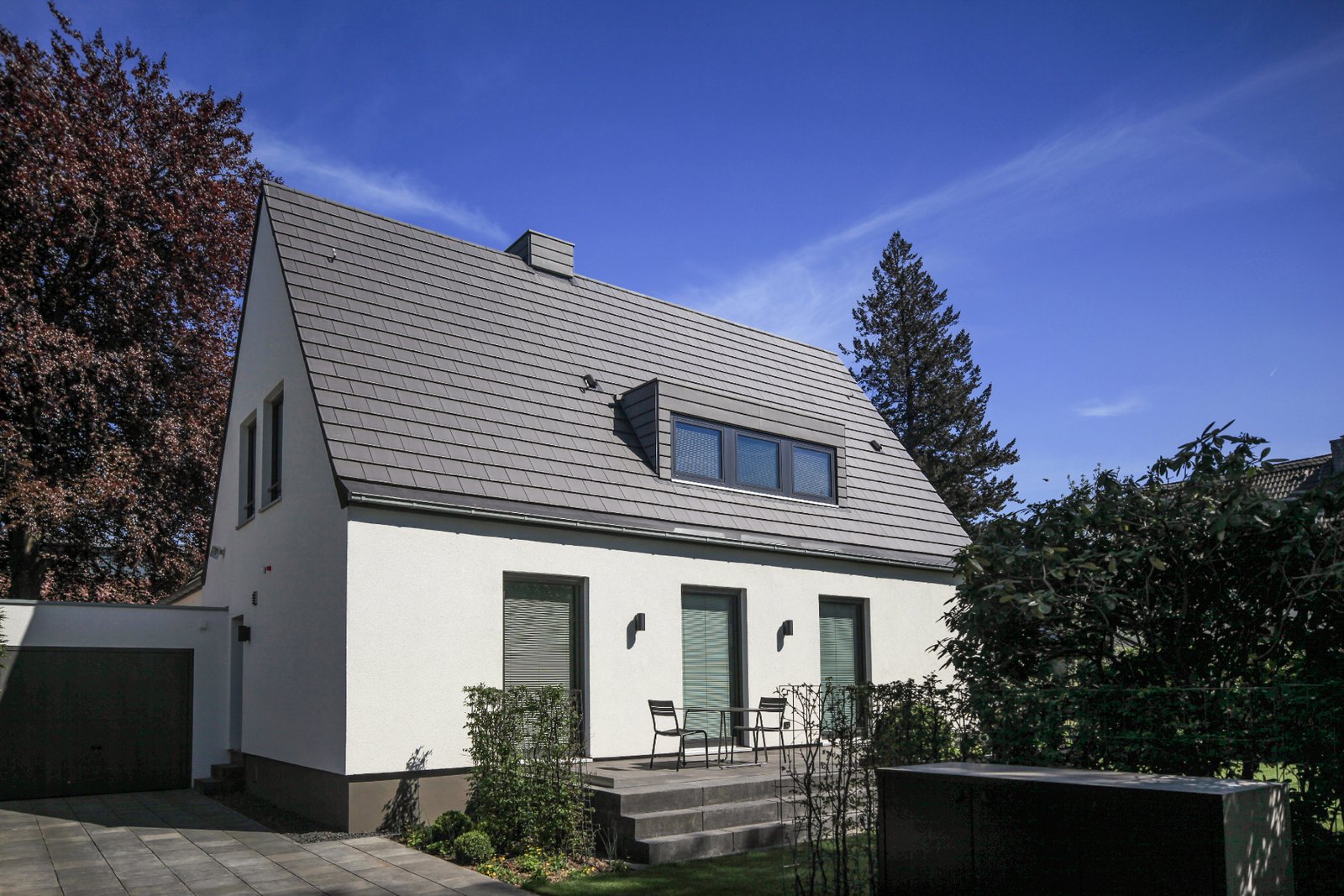 Alt und Neu sind anhand der Materialien ablesbar: der alte Baukörper wurde mit einer weißen Putzfassade versehen, das ergänzte Wohnzimmer erhielt zum Garten hin eine Aluminium-Fensteranlage, zur Straße eine horizontal gegliederte Fassade aus mineralischen Trapezprofilen.