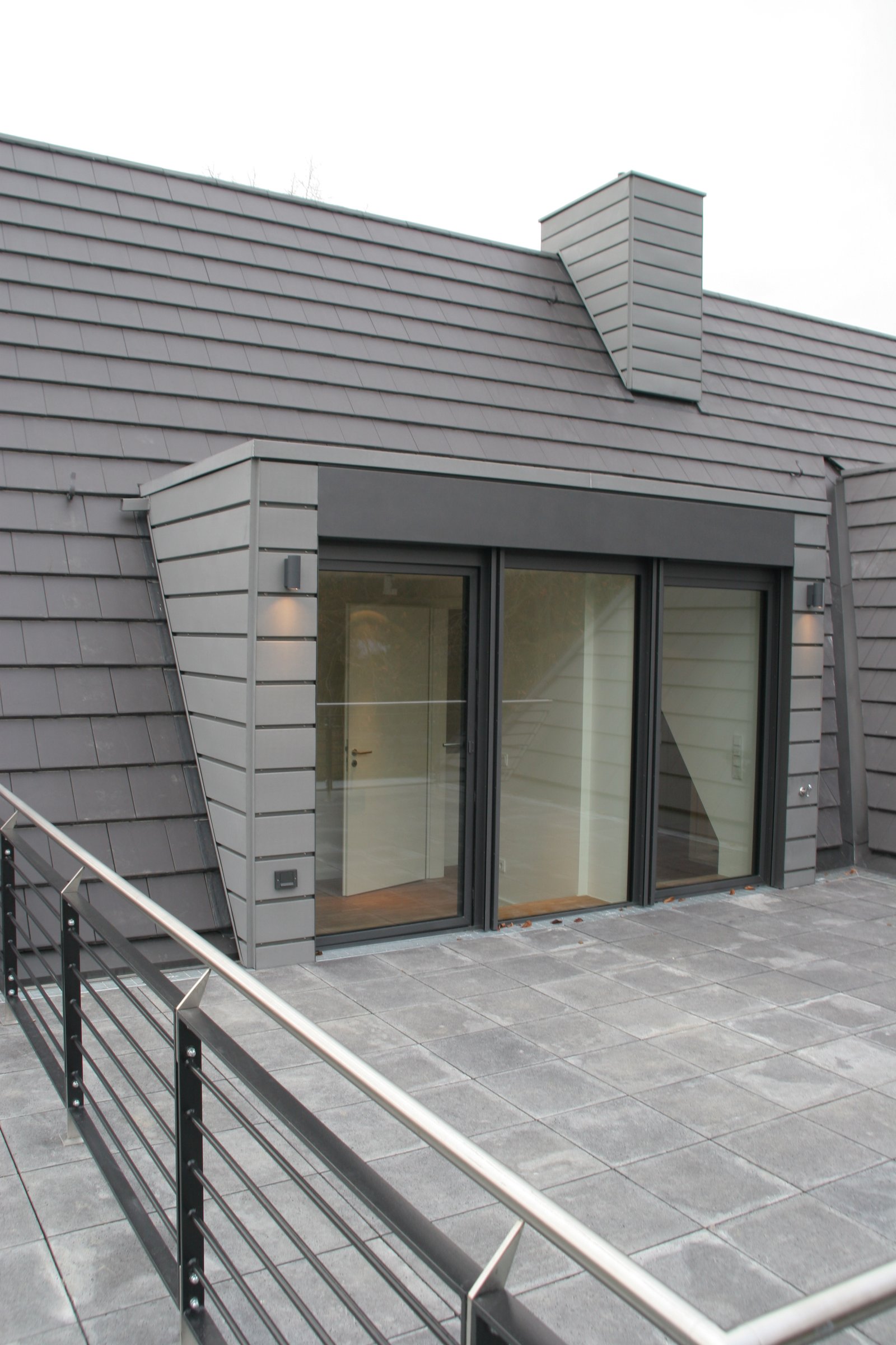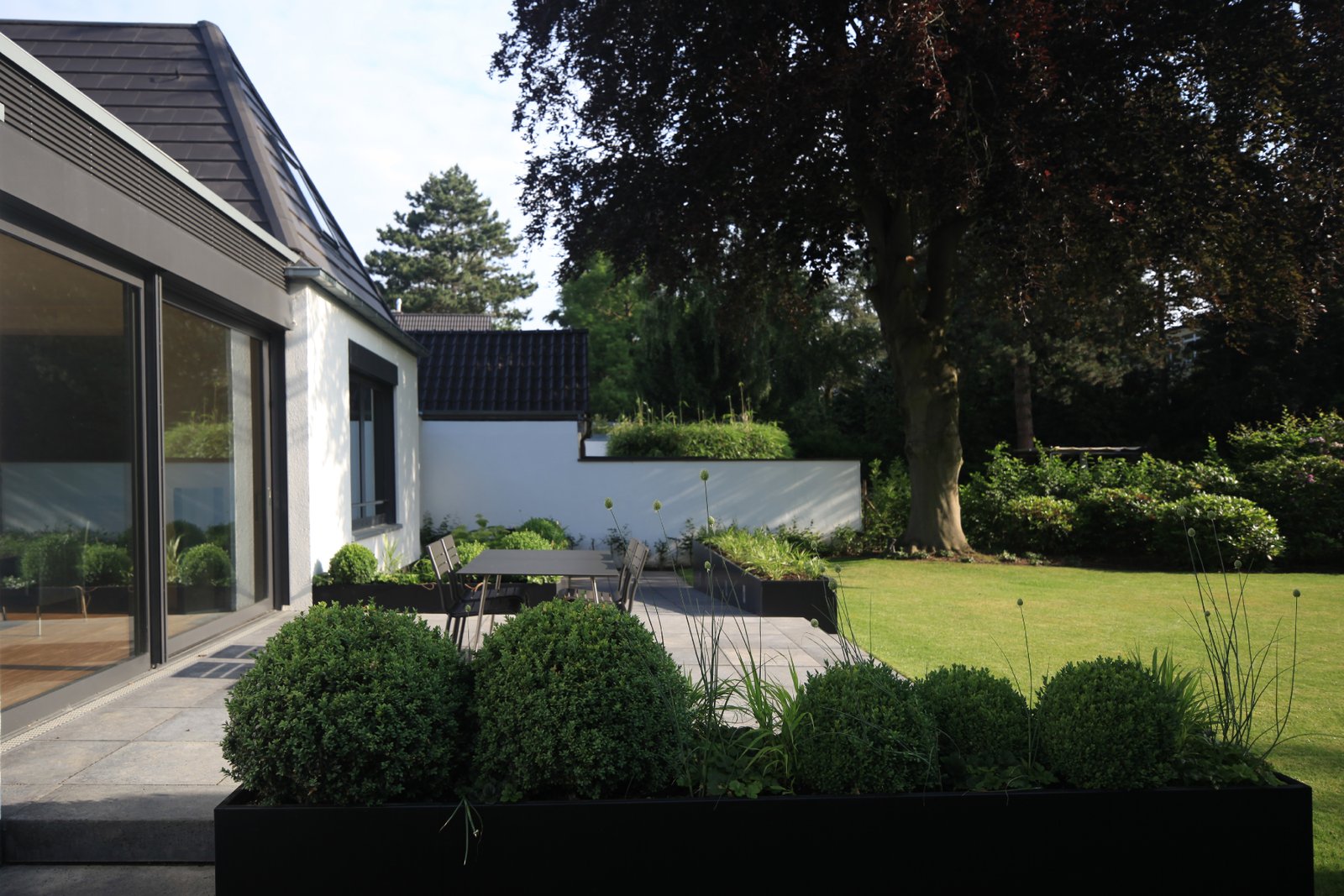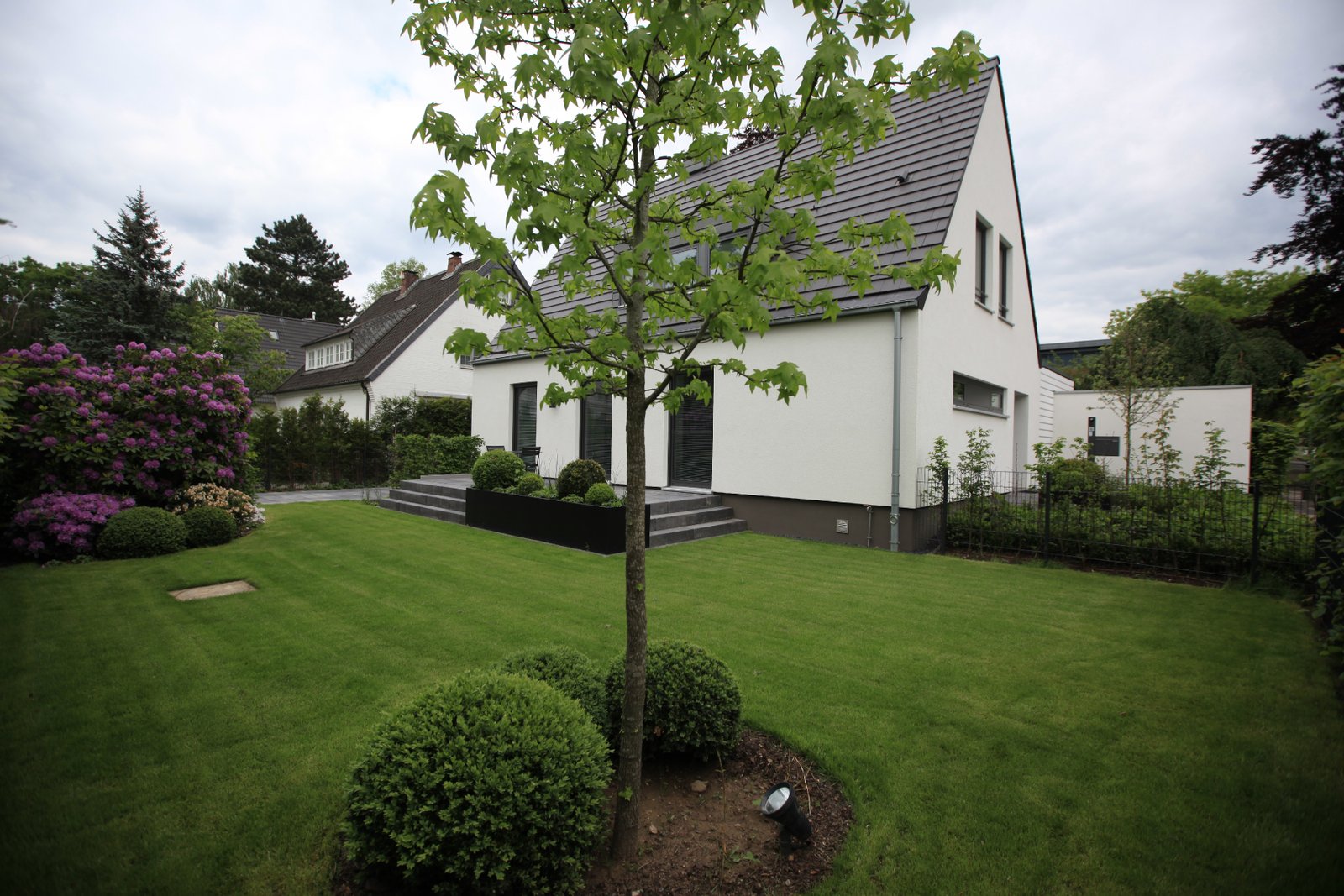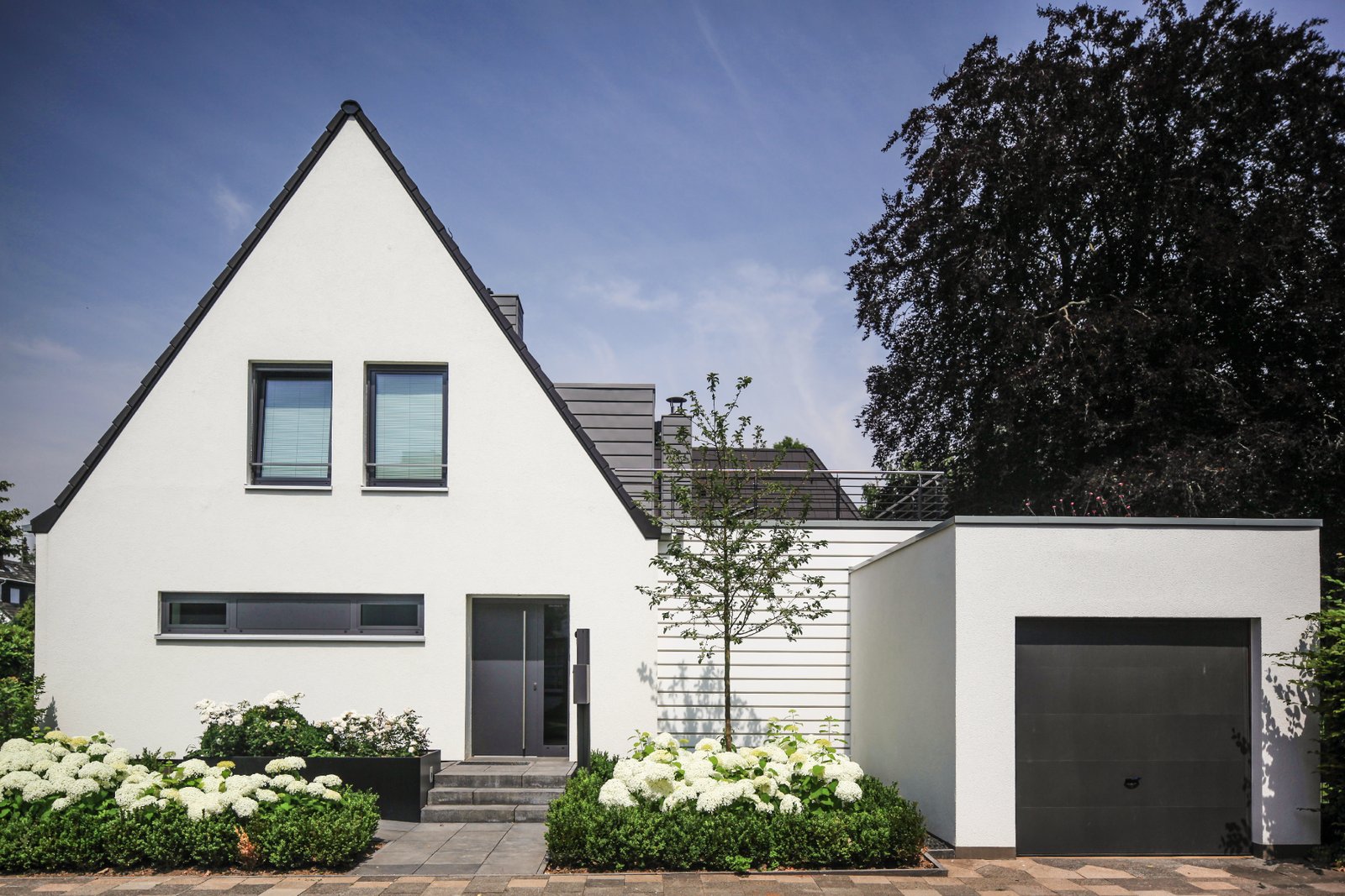 Alt und Neu sind anhand der Materialien ablesbar: der alte Baukörper wurde mit einer weißen Putzfassade versehen, das ergänzte Wohnzimmer erhielt zum Garten hin eine Aluminium-Fensteranlage, zur Straße eine horizontal gegliederte Fassade aus mineralischen Trapezprofilen.