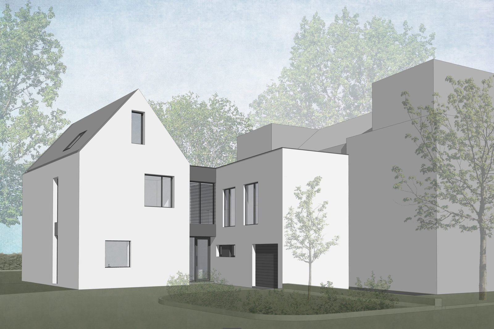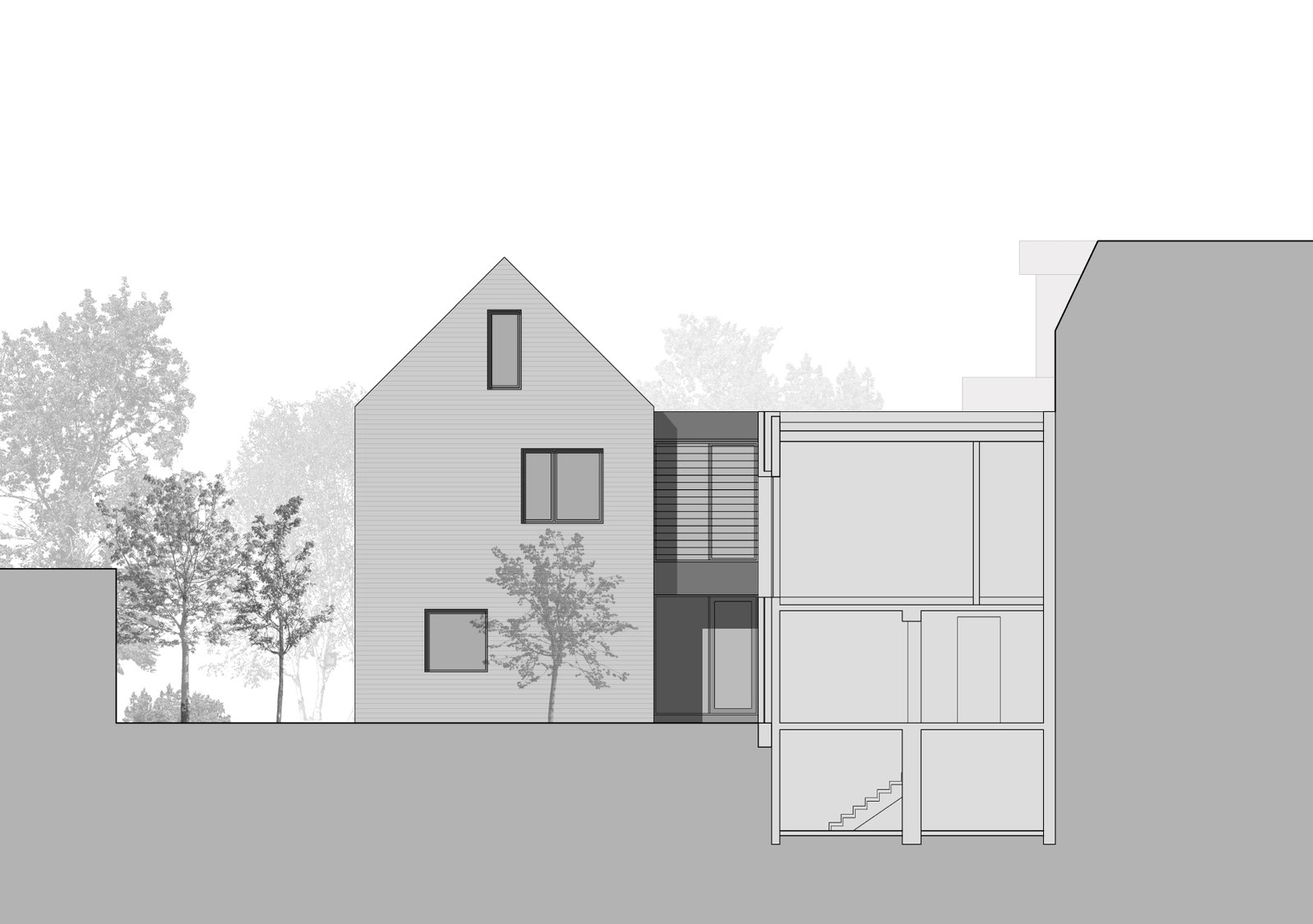 Der Altbau dient im Erdgeschoss weiterhin als Garage und verfügt über einen Keller, in dem die Haustechnik sowie Lagerräume untergebracht werden. Im Obergeschoss des Neubaus entstehen die Schlaf- und Kinderzimmer.