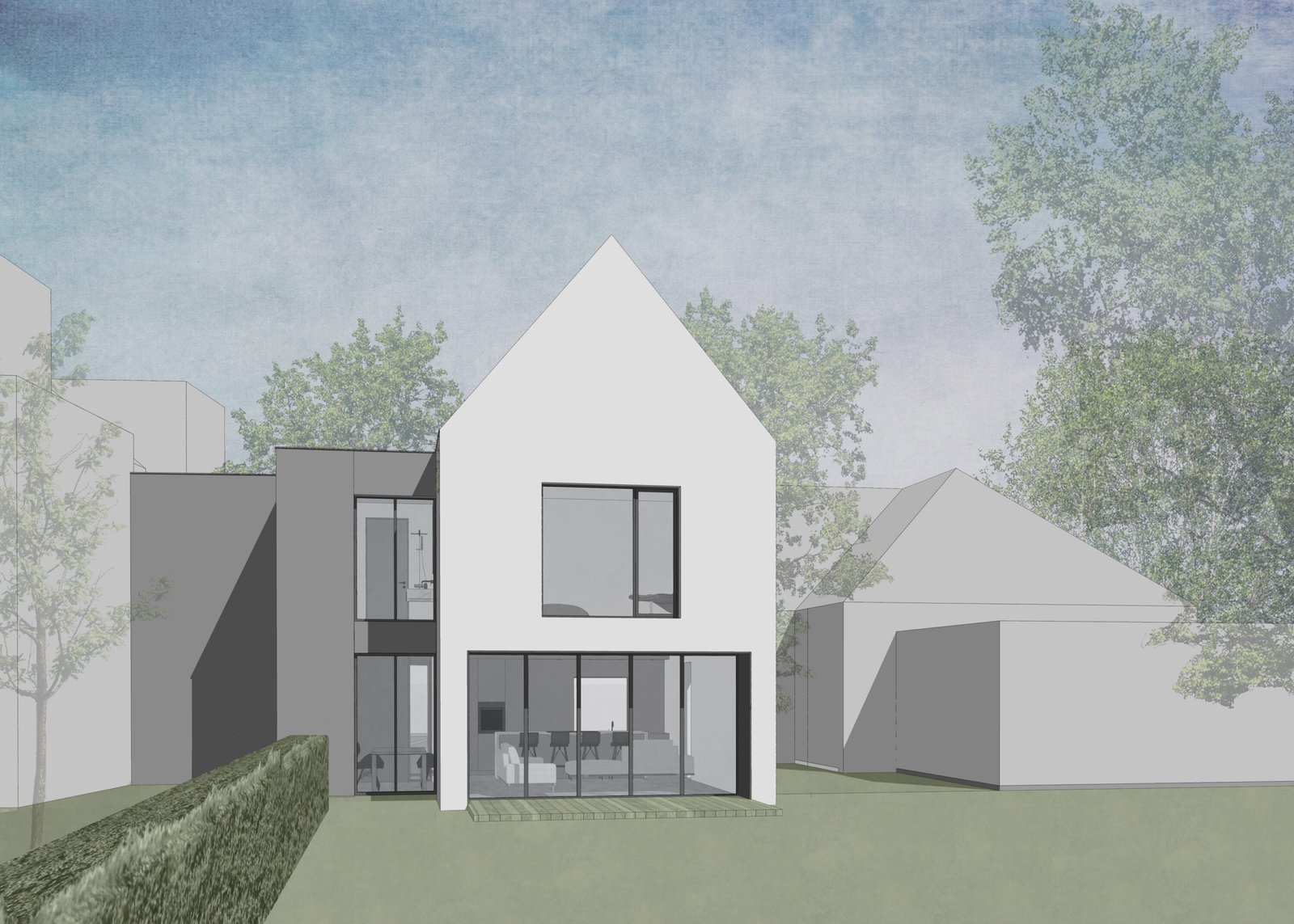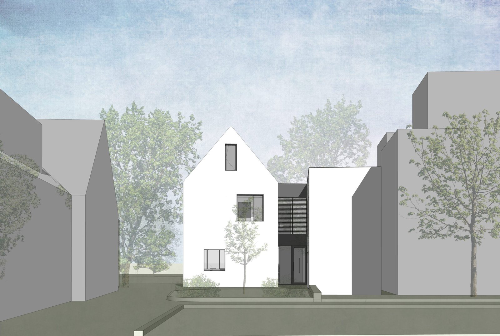 In einer alten Hofanlage nahe dem Rhein entsteht ein Wohnhaus, das ein ehemaliges Lagergebäude in den Neubau integriert. Die traditionelle Dachform und die Klinkerfassade fügen sich harmonisch in die bestehende Umgebung ein und nehmen Bezug zur historischen Bebauung.