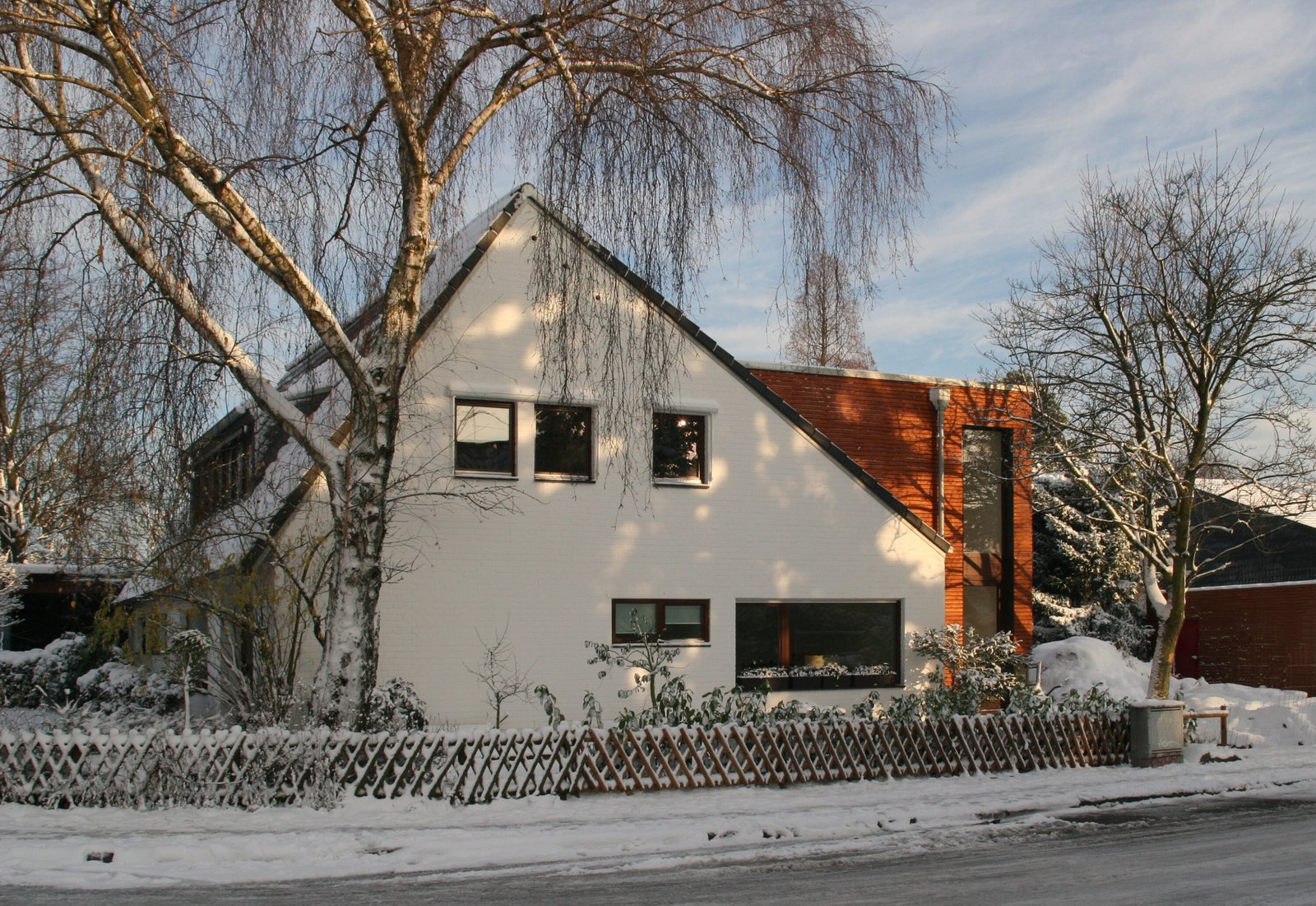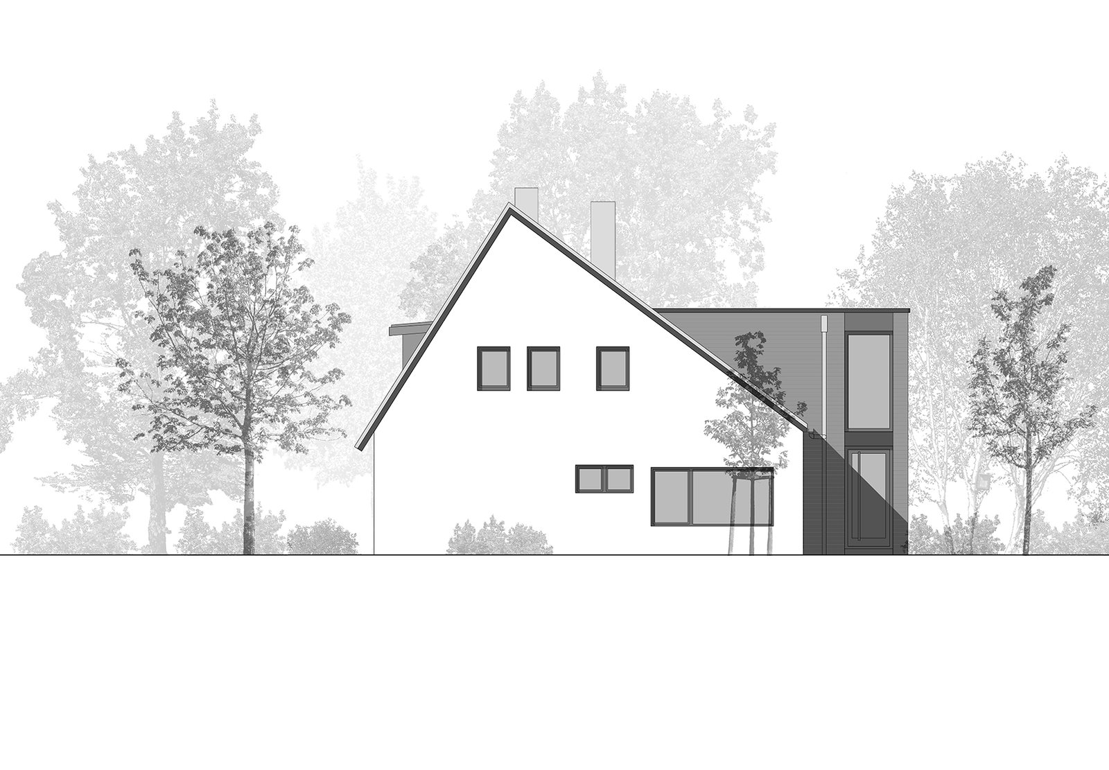 Das Wohnhaus aus den 60er Jahren wurde erweitert, uzm Platz für eine weitere Wohneinheit zu schaffen. Die Trennung der Wohnungen erfolgt geschossweise, so dass die Erdgeschoss-Wohnung barrierefrei hergestellt werden kann. Der zusätzlich benötigte Platzbedarf wird durch einen zweigeschossigen Erweiterungsbaukörper gewonnen.