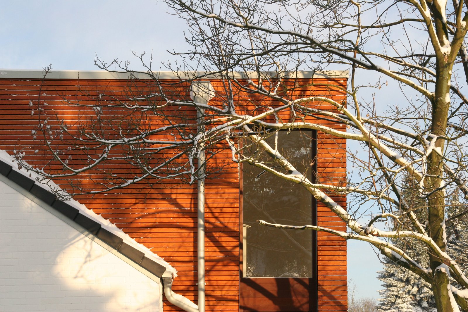 Dieser Anbau befindet sich auf der Gartenseite des Hauses und beherbergt auch eine neue Treppe für den separaten Zugang zur Wohnung im Obergeschoss. Um den Charakter des Altbaus zu erhalten, wird die Erweiterung erkennbar als neu hinzugefügtes Bauteil gestaltet. Als Kontrast zur weiß geschlämmten Ziegelfassade des Bestandsgebäudes erhält er eine Fassade aus Holzlamellen, sowie großformatige Fensterflächen.