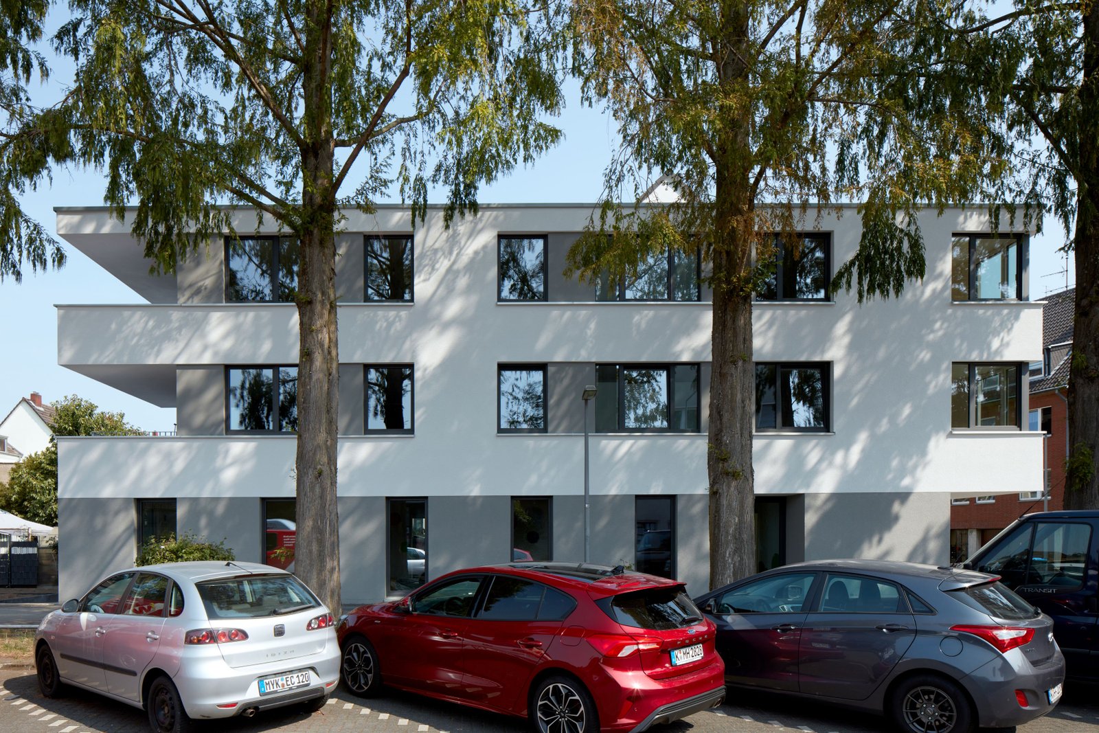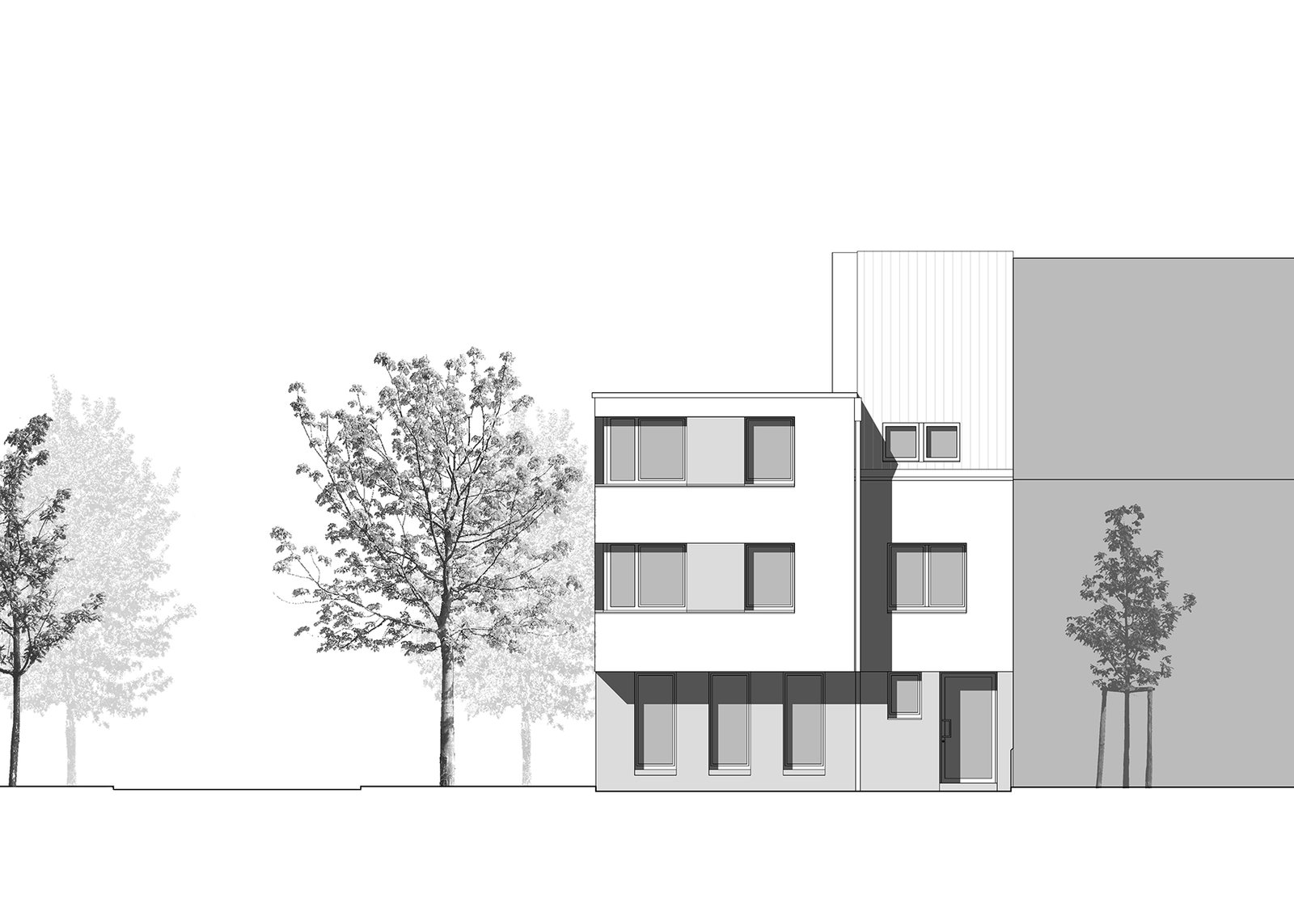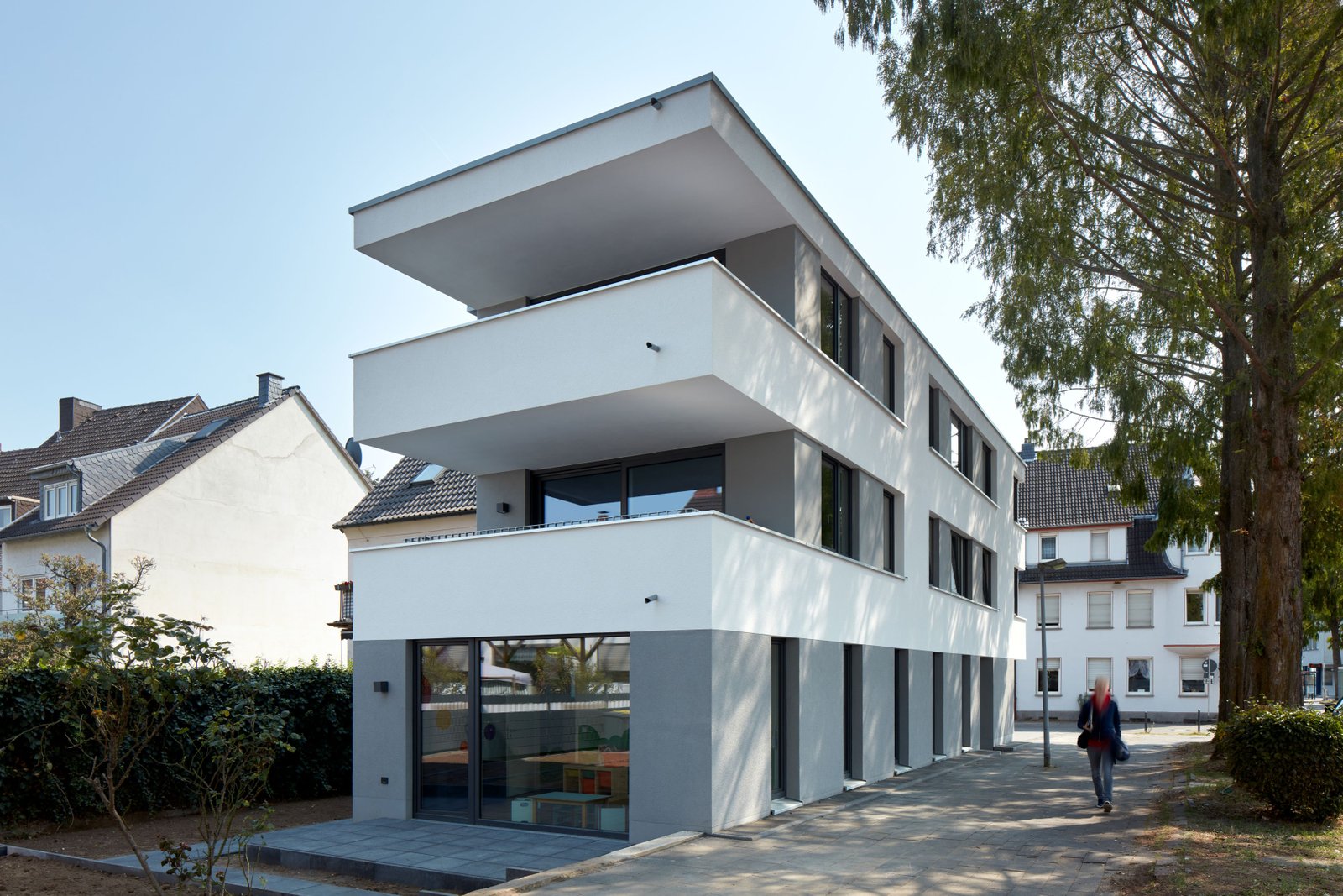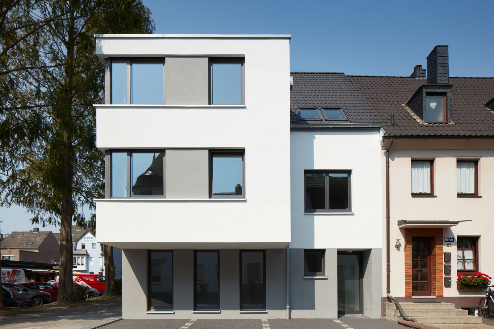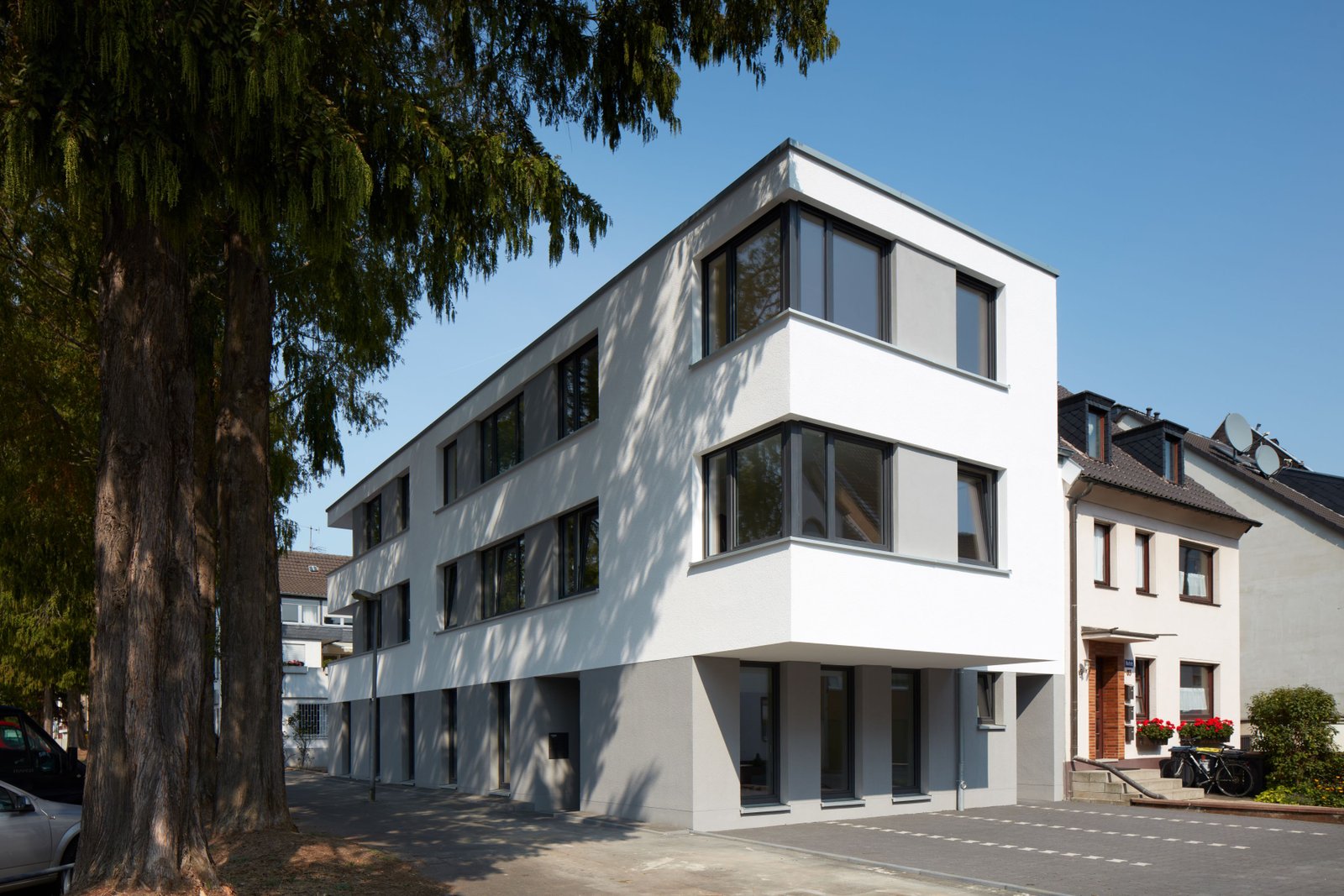 Anschließend an eine traufständige Reihenbebauung bildet der Neubau den Abschluss auf einem Eckgrundstück. Diese Sonderstellung im Stadtraum führt zu der Gebäudeform. Den Anschluss an die Nachbarbebauung bildet ein in Gebäudehöhe und Dachform eingehender Gebäudeteil, der im Wesentlichen die vertikale Erschließung übernimmt und damit den Zugang zu den obergeschossigen Wohnungen bildet. Abschluss findet die Reihenbebauung in einem mit Flachdach ausgeführten Querriegel. Durch ein zurückgesetztes Erdgeschoss schwebt der Kubus.