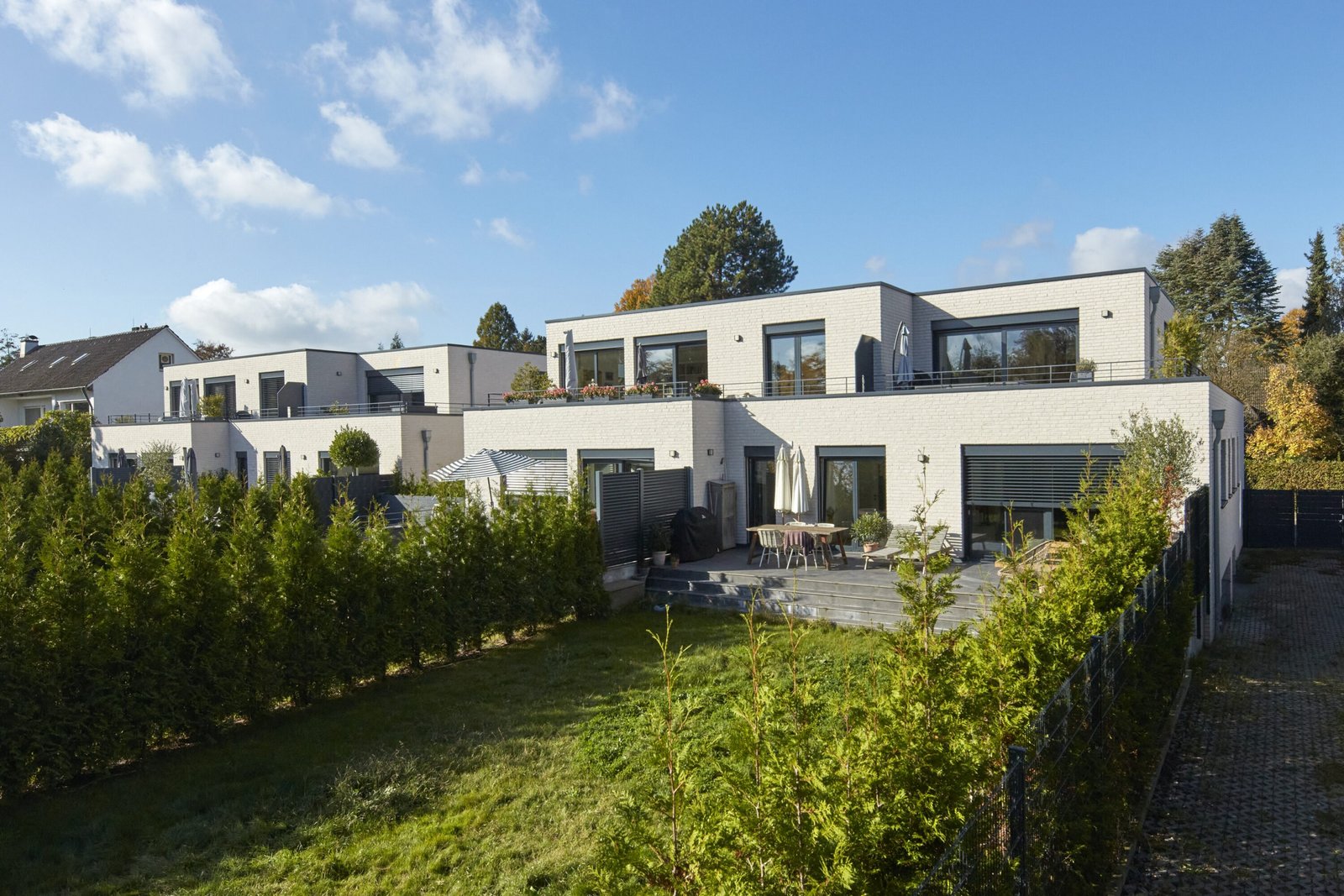 Um ein großes Bauvolumen in einem von kleinteiliger Einfamilienhausbebauung geprägten Gebiet städtebaulich einzupassen, wurde das Gebäude mit insgesamt zehn Wohneinheiten in zwei Baukörper gegliedert. Damit trotz der vorgegebenen Höhenbeschränkung eine wirtschaftlich sinnvolle Wohnfläche erreicht werden konnte, wird das Sockelgeschoss im straßenseitigen Bereich zu Wohnzwecken genutzt und bildet gemeinsam mit dem darüber positionieren Wohnraum im EG Maisonettewohnungen.