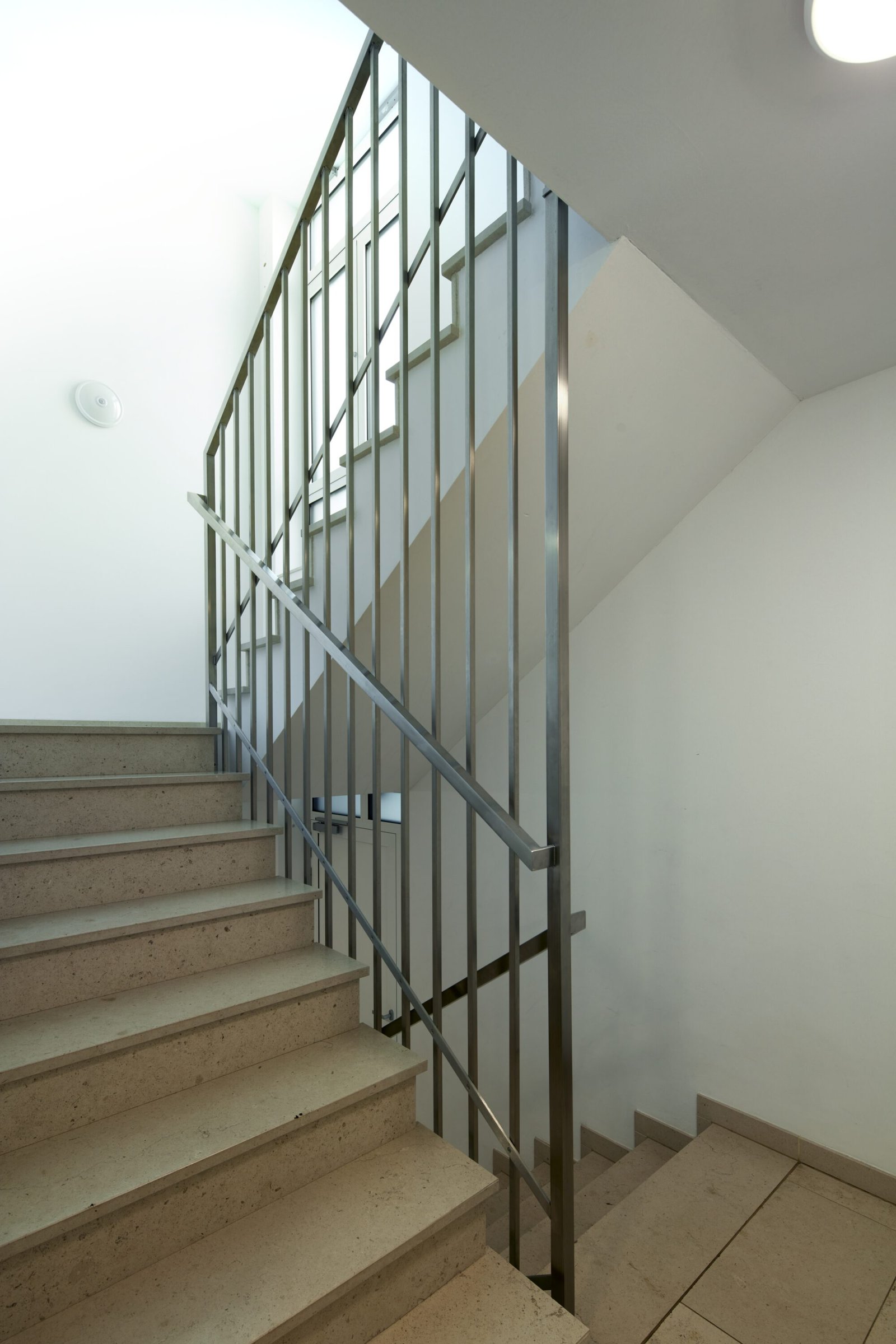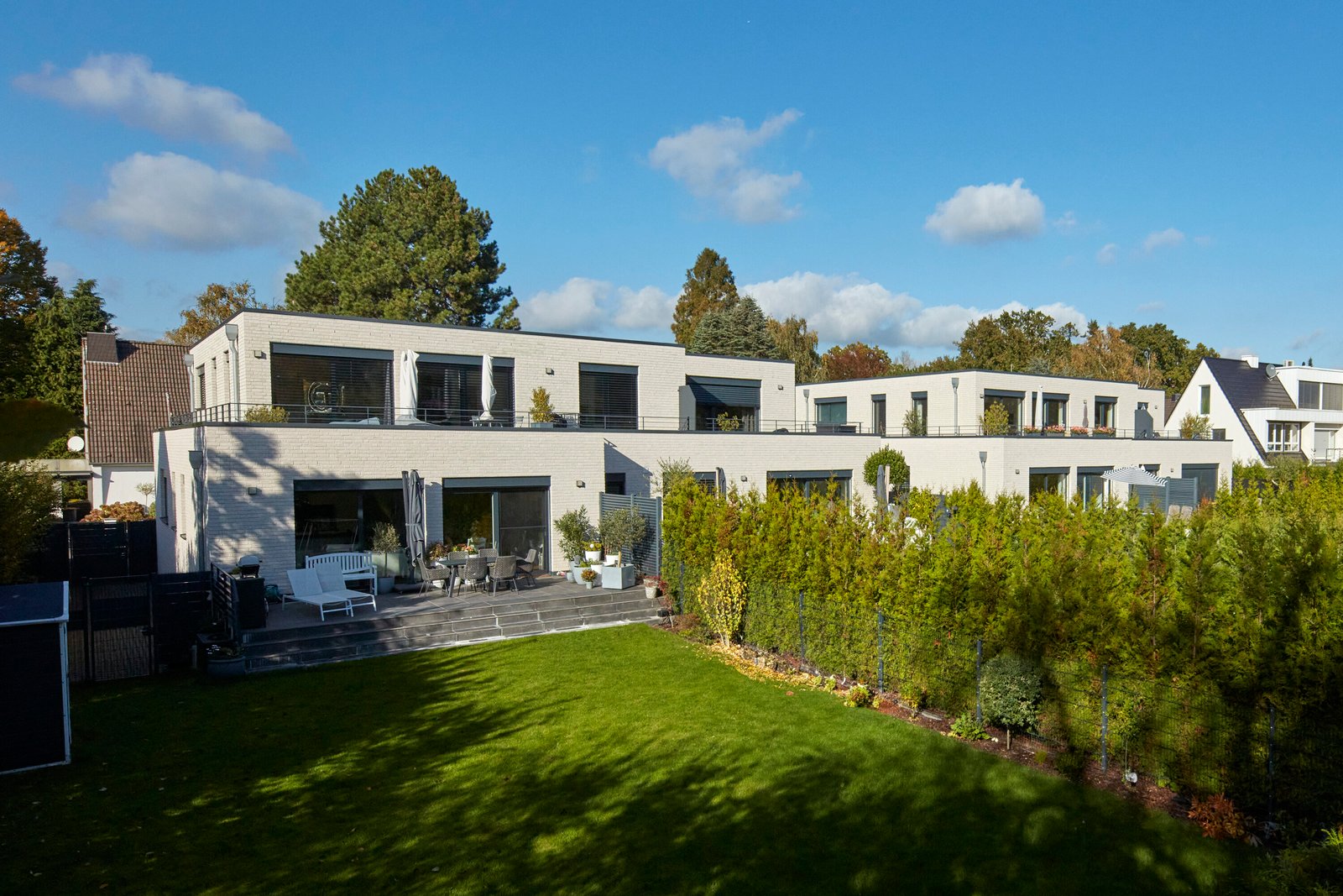 Die gewünschte kleinmaßstäbliche Wirkung bei gleichzeitiger Realisierung der hochwertig ausgestatteten großen Wohnungen ließ sich nicht zuletzt durch die Dachgeschossausführung als zurück versetztes Staffelgeschoss erreichen.