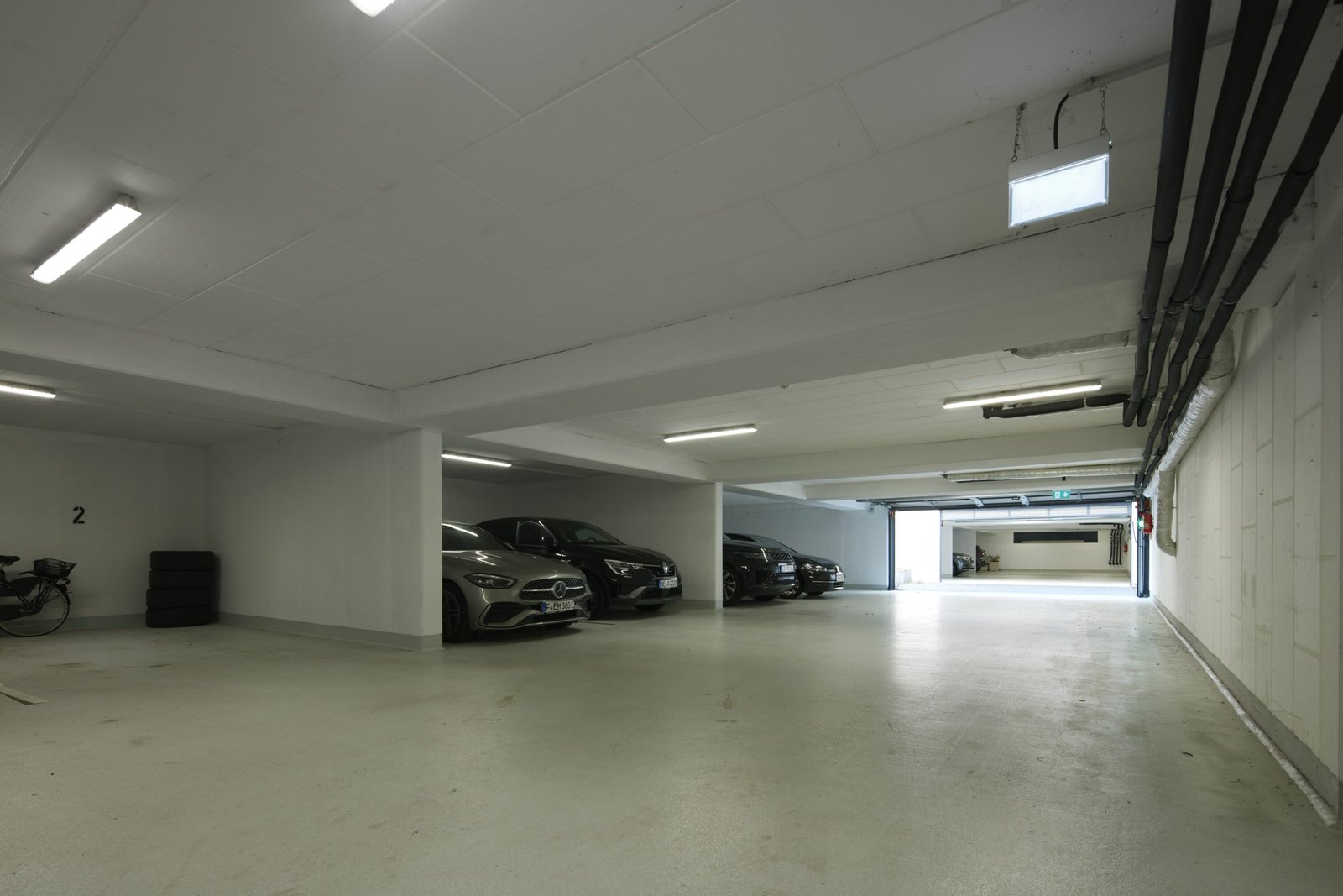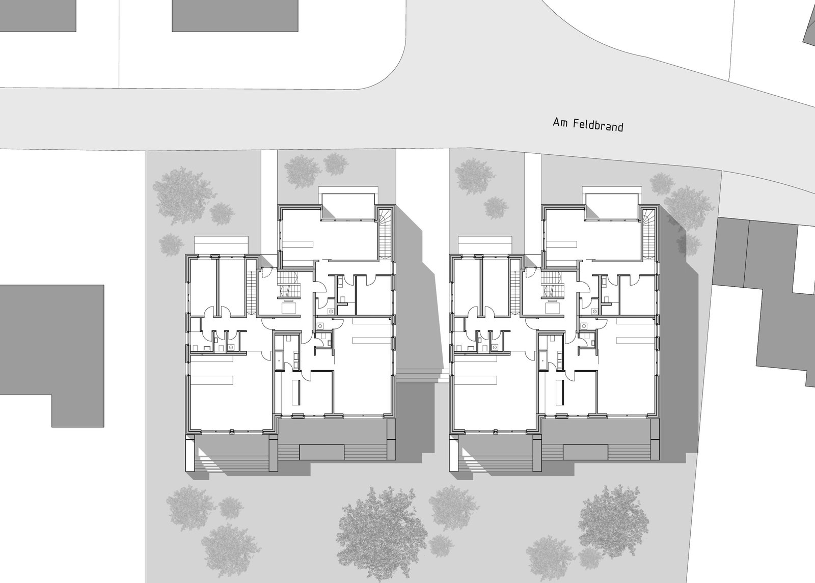 Die notwendige Tiefgaragenzufahrt bildet die Fuge zwischen den zwei baugleichen geklinkerten Baukörpern. Die Tiefgarage ist im hinteren Bereich des Sockelgeschosses angeordnet und kann durch die Fassadenöffnungen natürlich belüftet werden