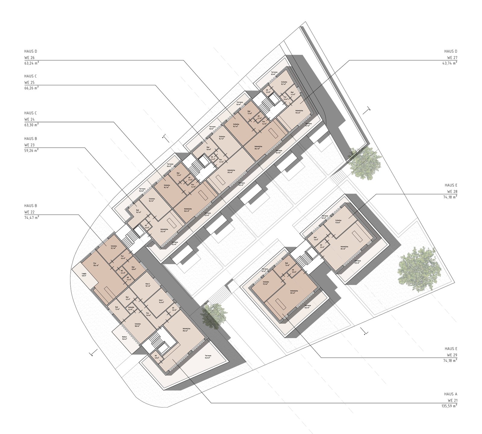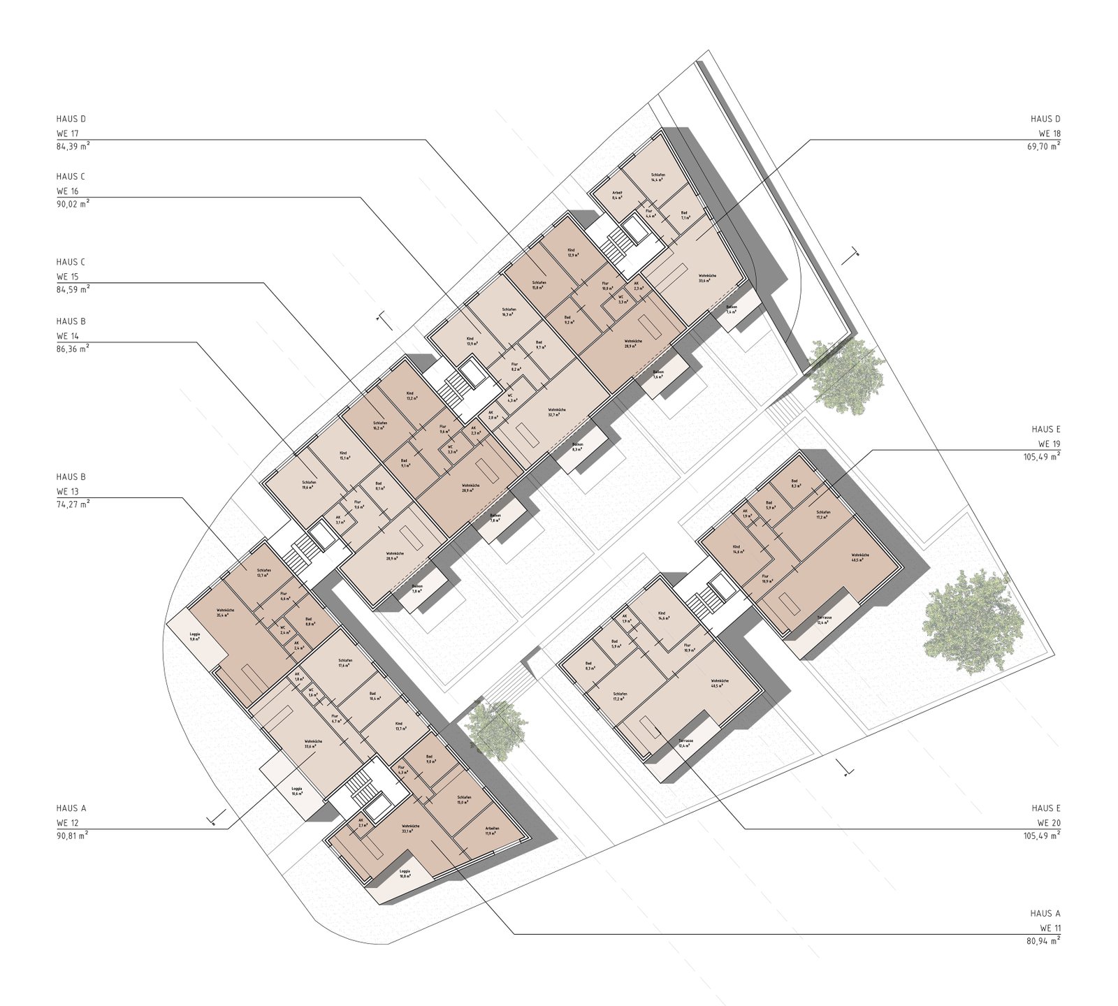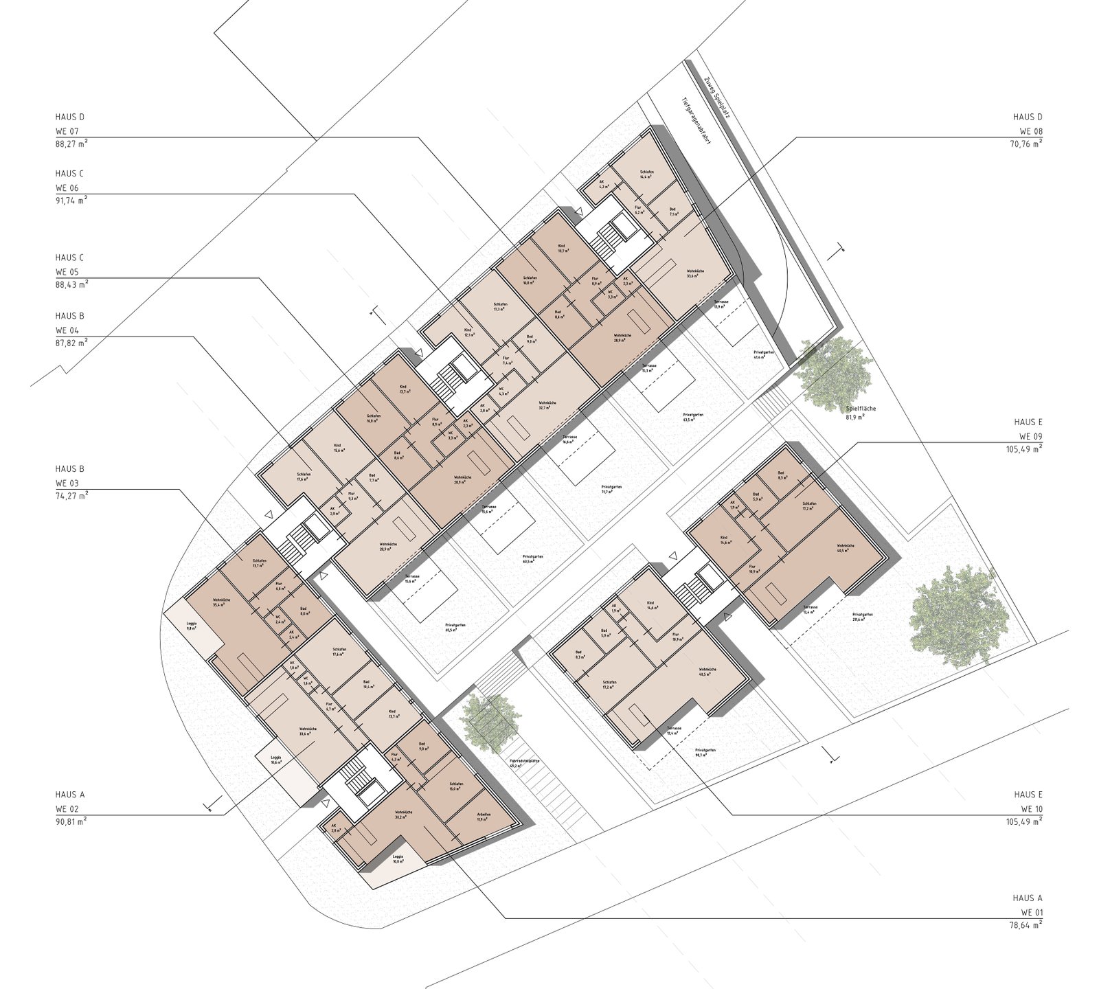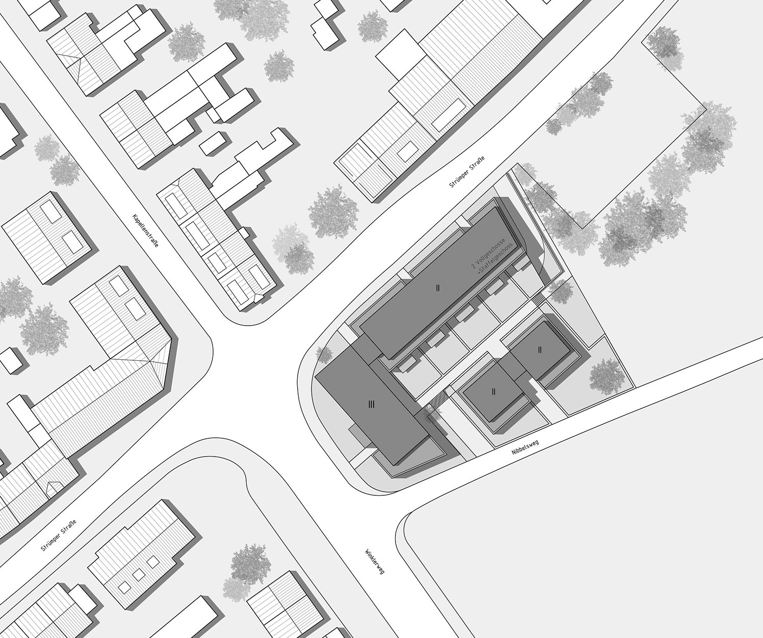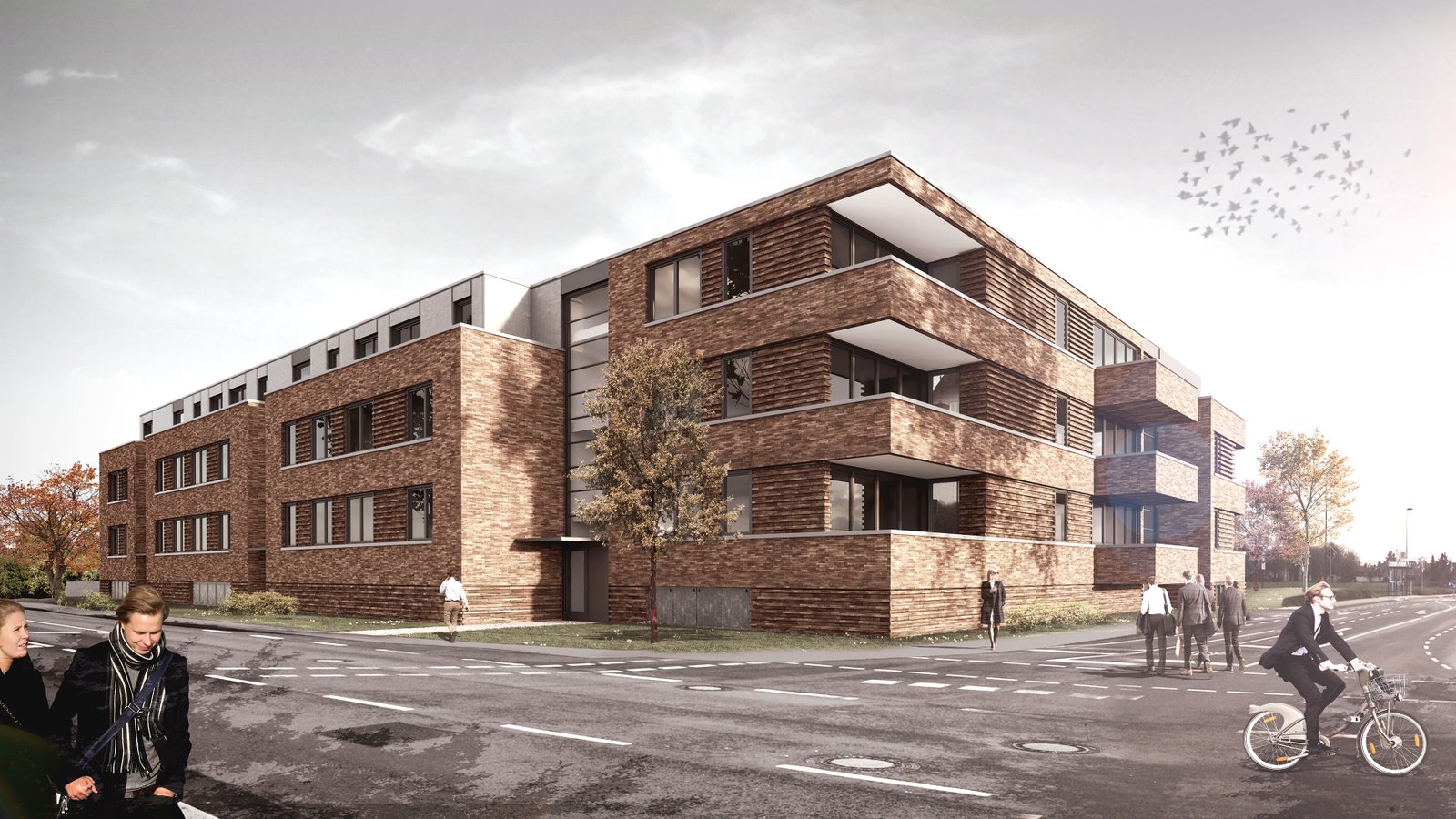 An einem zentralen Kreuzungspunkt soll eine Wohnbebauung mit einem Wohnungsmix aus Zwei- bis Vierzimmerwohnungen entstehen. Der Entwurf zeigt eine zweieinhalb- bis dreigeschossige Blockrandbebauung, welche mit seinem L-förmigen Baukörper den Kreuzungspunkt städtebaulich einfasst und auf der Gegenseite einen zur öffentlichen Straße abgeschirmten Innenbereich mit privaten- als auch halböffentlichen Freiflächen bietet. Im südlichen Teil des Innenbereiches schließen zwei weitere zweieinhalbgeschossige Einzelbaukörper an, welche den Innenbereich zusätzlich eingrenzen und einen ruhigen, innenhofähnlichen Charakter mit hoher Aufenthaltsqualität für die Bewohner entstehen lassen.