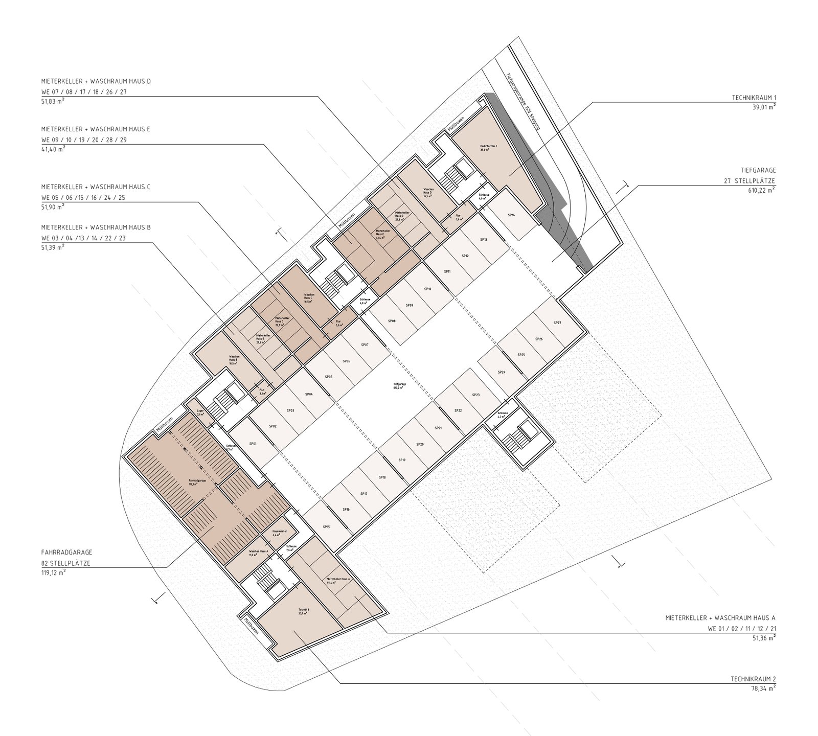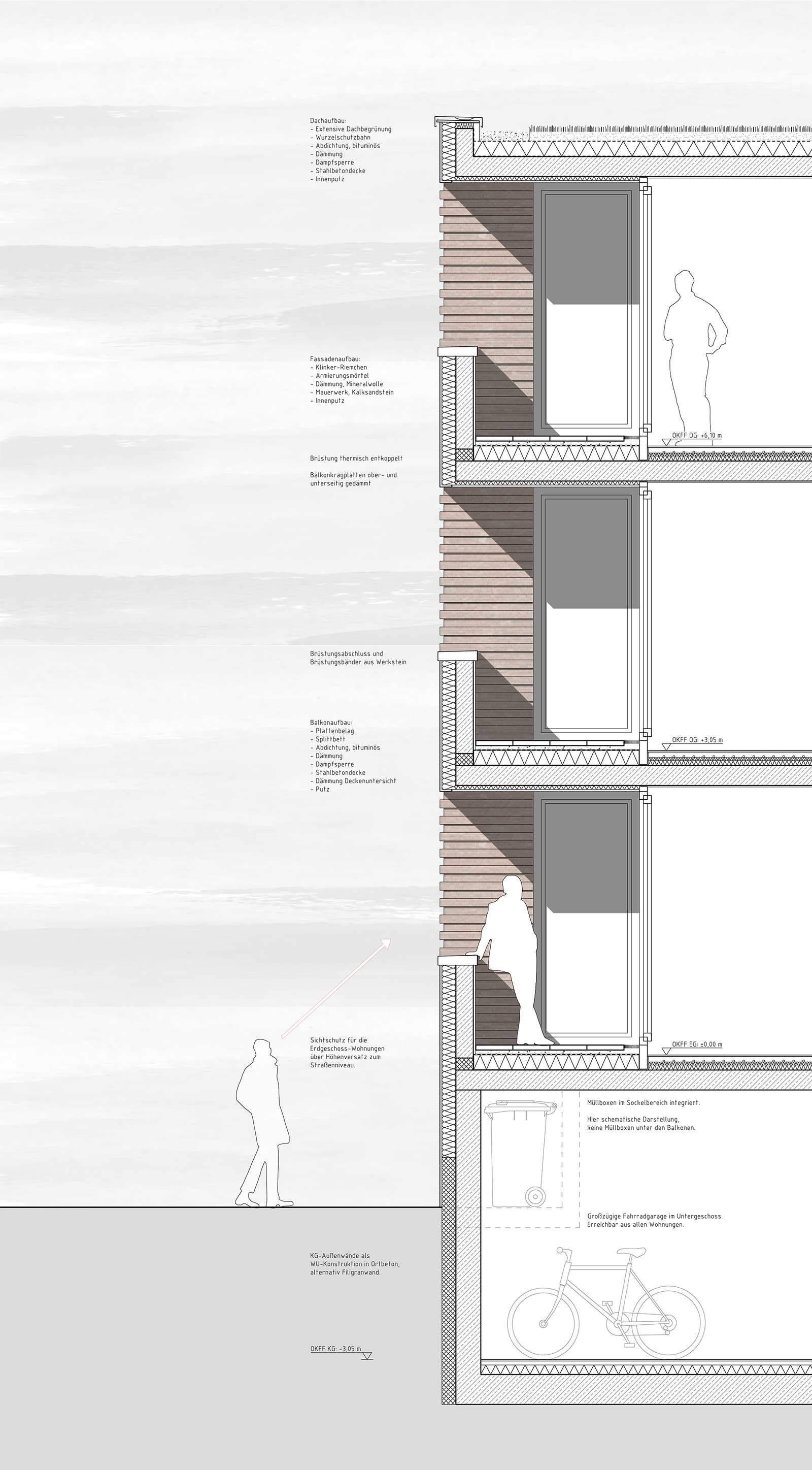 Das Erdgeschoss befindet sich ein halbes Geschoss über dem Straßenniveau, wodurch auch bei den Erdgeschoss-Wohnungen für eine angemessene Privatsphäre gesorgt wird. Darunter befindet sich halbeingegraben das Untergeschoss mit einer großzügigen Tiefgarage, Fahrradgarage sowie privaten Kellerräumen. Die Treppenhäuser sind mit einem Aufzug ausgestattet und verbinden alle Geschosse und Gebäudezugänge mit den Wohneinheiten, wodurch sämtliche Wohnungen barrierefrei erschließbar sind.