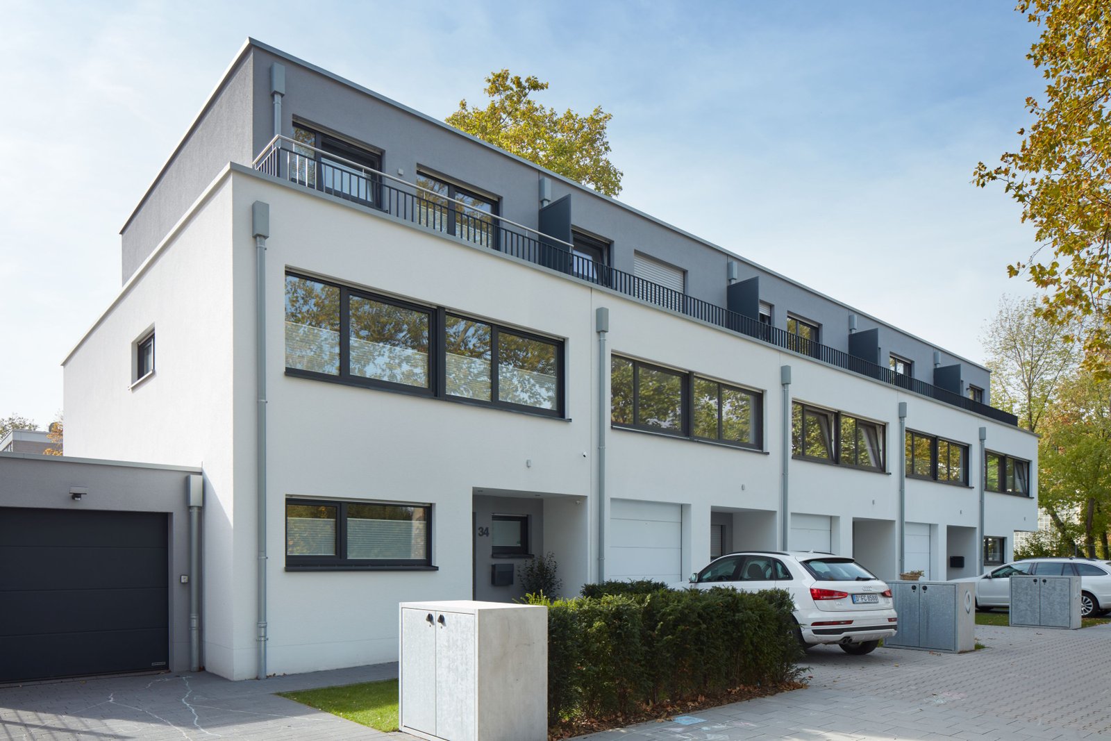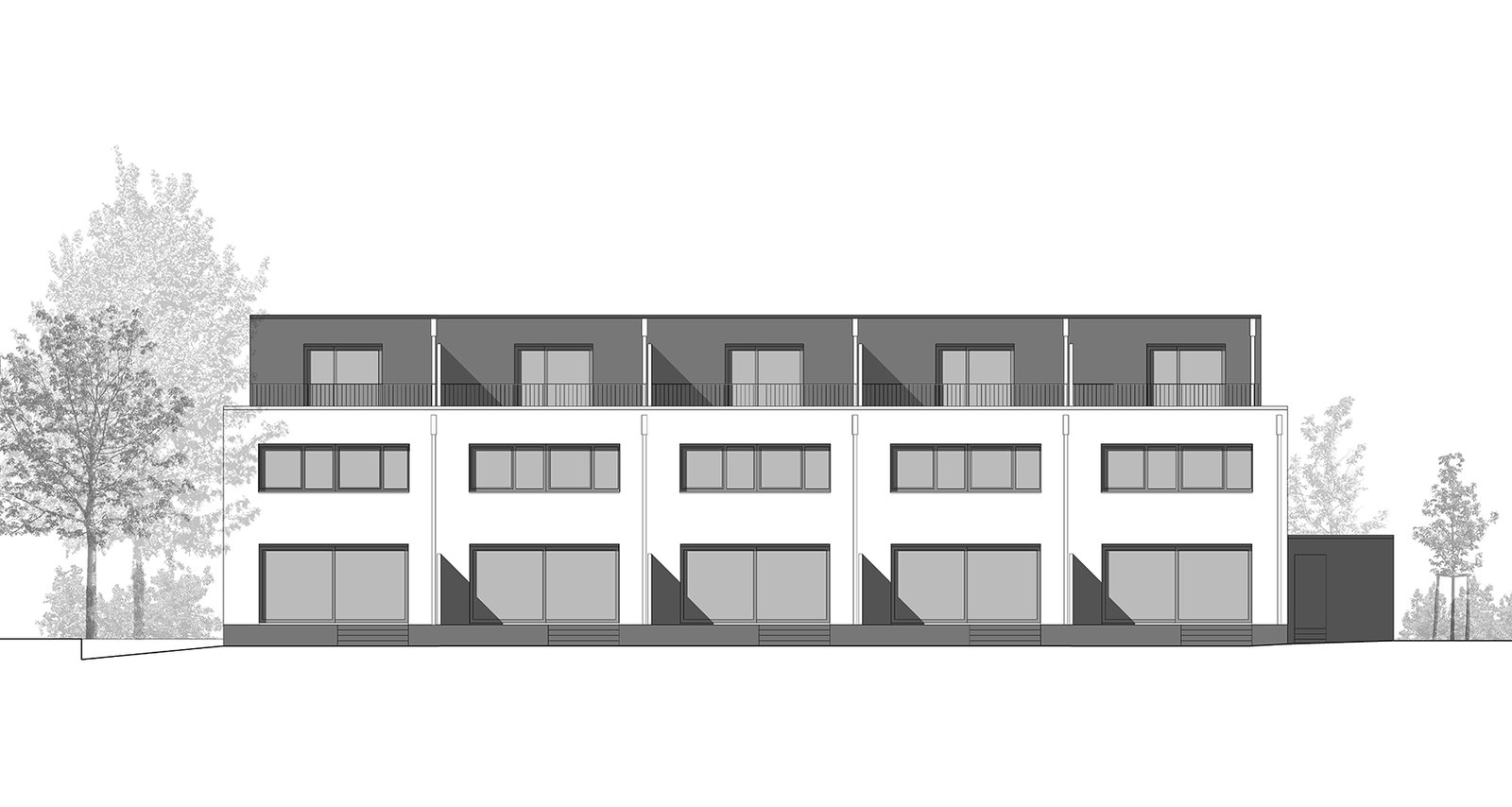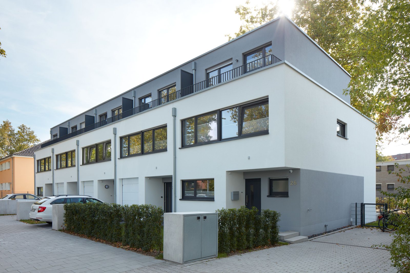 Auf einem innerstädtischen Grundstück wurden fünf moderne, Reihenhäuser mit jeweils zwei Vollgeschossen und Staffelgeschoss realisiert. Die Fassaden aller Häuser sind hell verputzt (WDVS) und durch zurückgesetzte Eingangsbereiche gegliedert, die einen Witterungsschutz bieten und die Privatsphäre der Erschließungszonen erhöhen. Rücksprünge und eine zweifarbige Gestaltung sorgen für eine klare Rhythmisierung und lassen jedes Haus als eigenständige Einheit wirken.