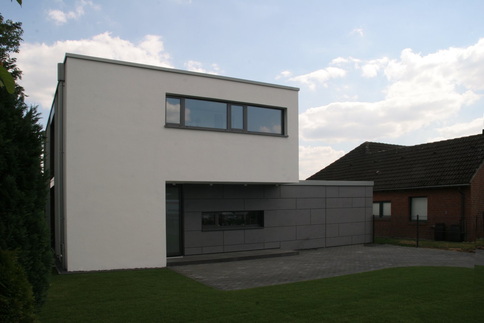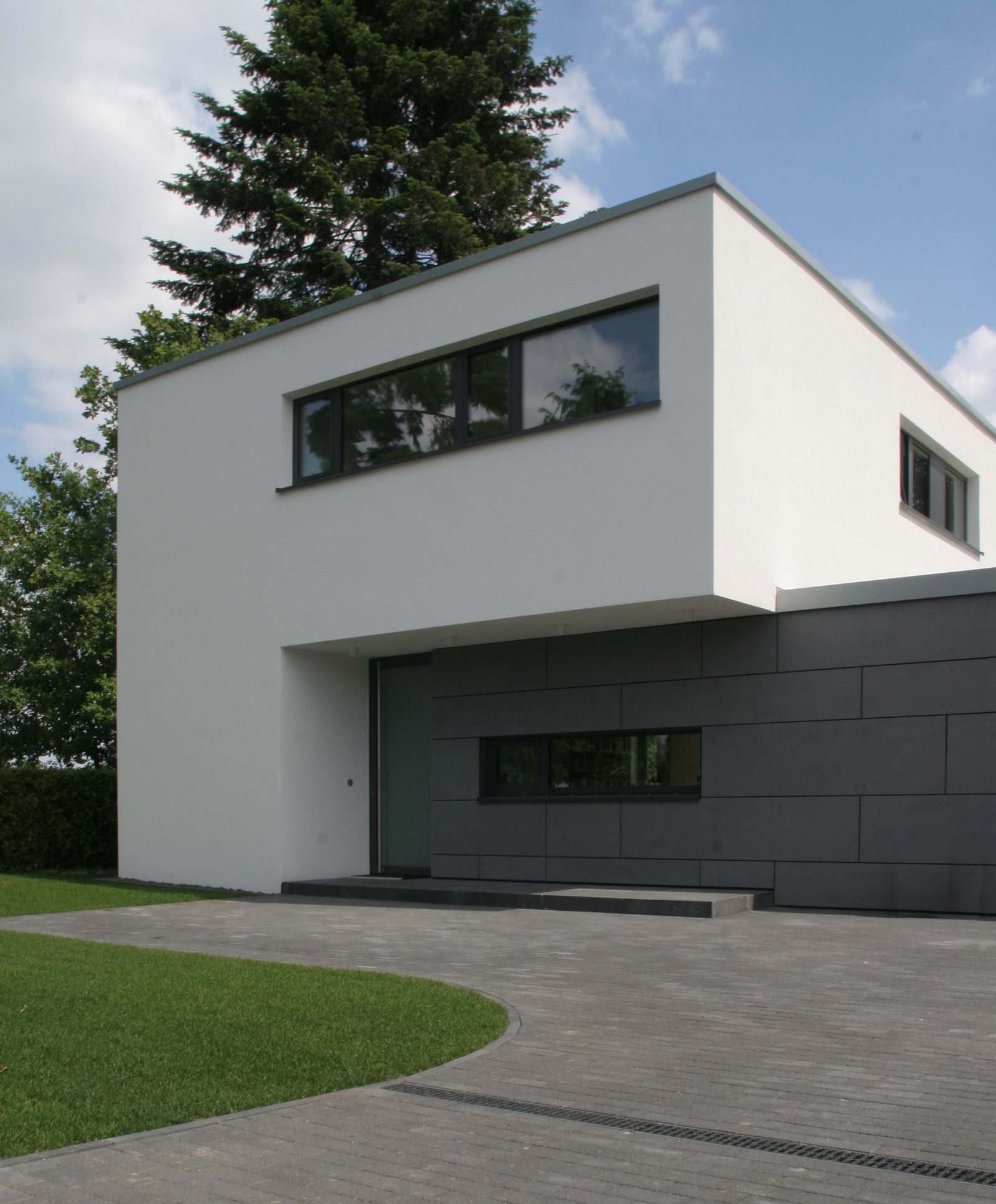 Das Erdgeschoss ist offen konzipiert. Die Individualräume im Obergeschoss sind über eine in einen zweigeschossigen Luftraum eingesetzte Treppe erschlossen. Die Fenster werden durch einen außenliegenden Sonnenschutz, der Teil der raumhohen Fensteranlagen ist, verschattet. Das zweigeschossige Wohn- und eingeschossige Nebengebäude sind ineinander verschränkt, ihre Körper aber durch das unterschiedliche Fassadenmaterialien ablesbar. Der Grauton der Faserzementtafeln, mit denen der Nebenbaukörper verkleidet ist, fügt sich in das Farbkonzept, geprägt durch Aluminiumfensteranlagen, Pflaster- und Fliesenbeläge, ein.