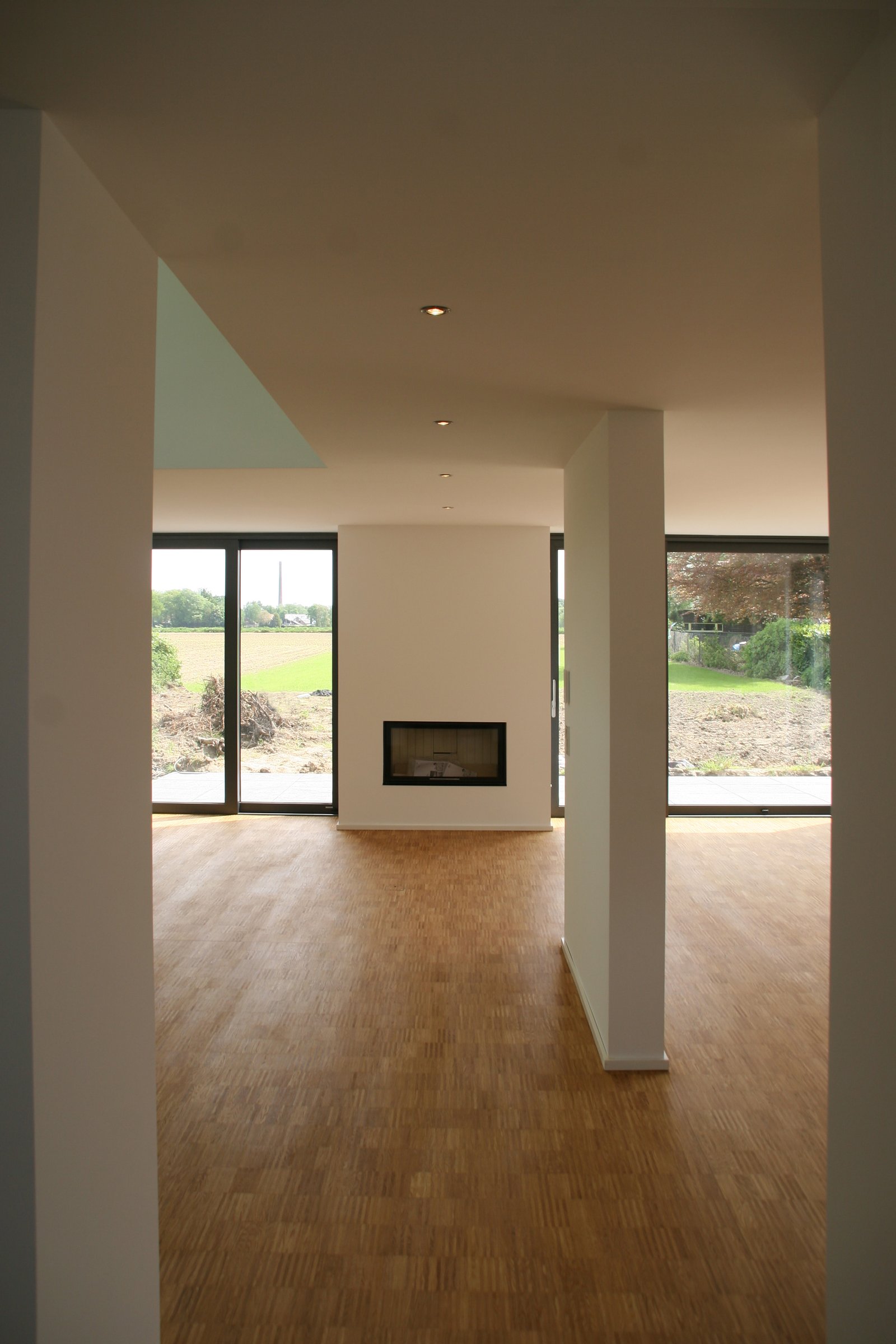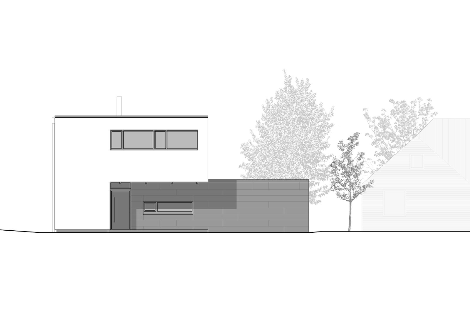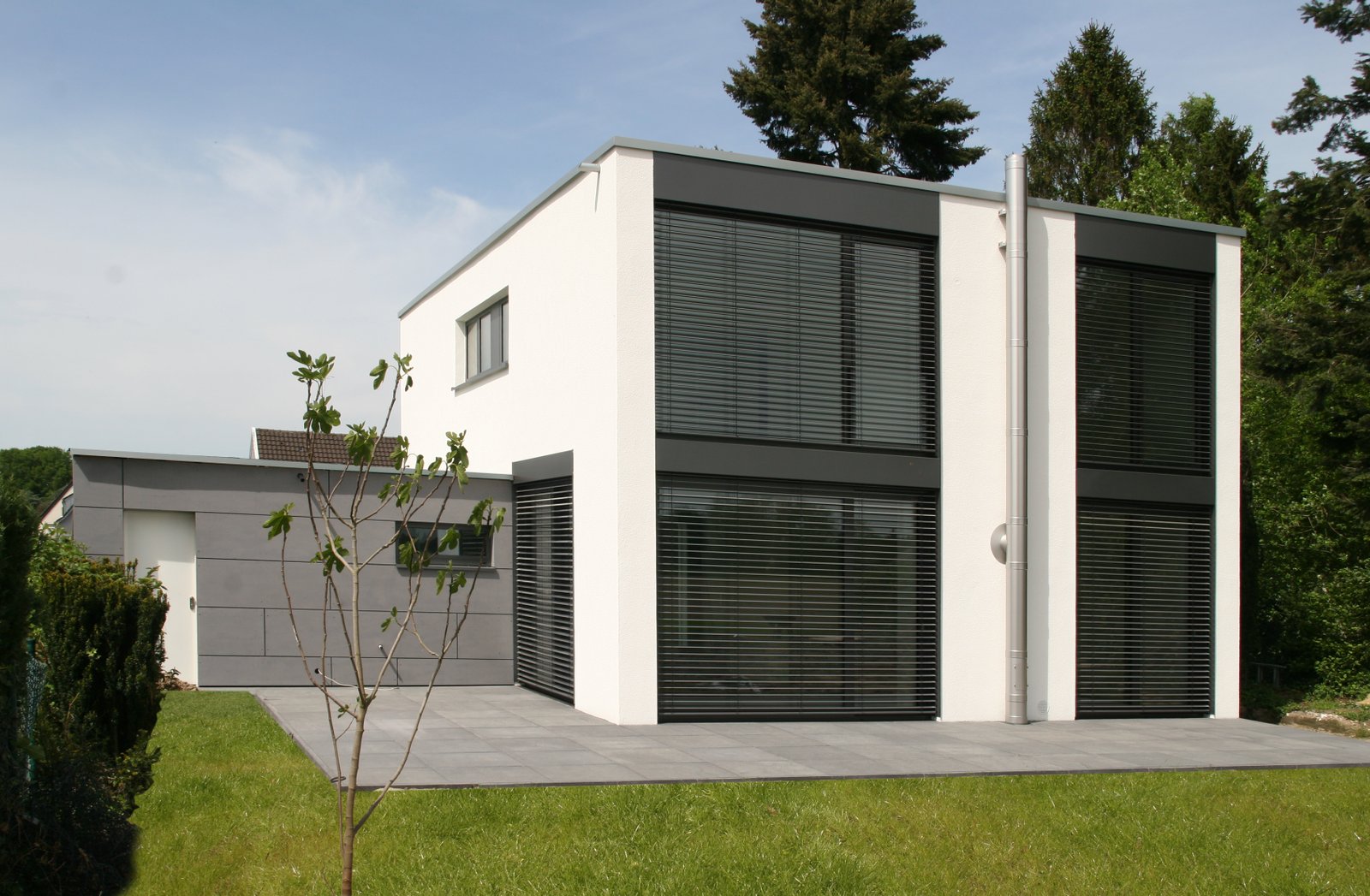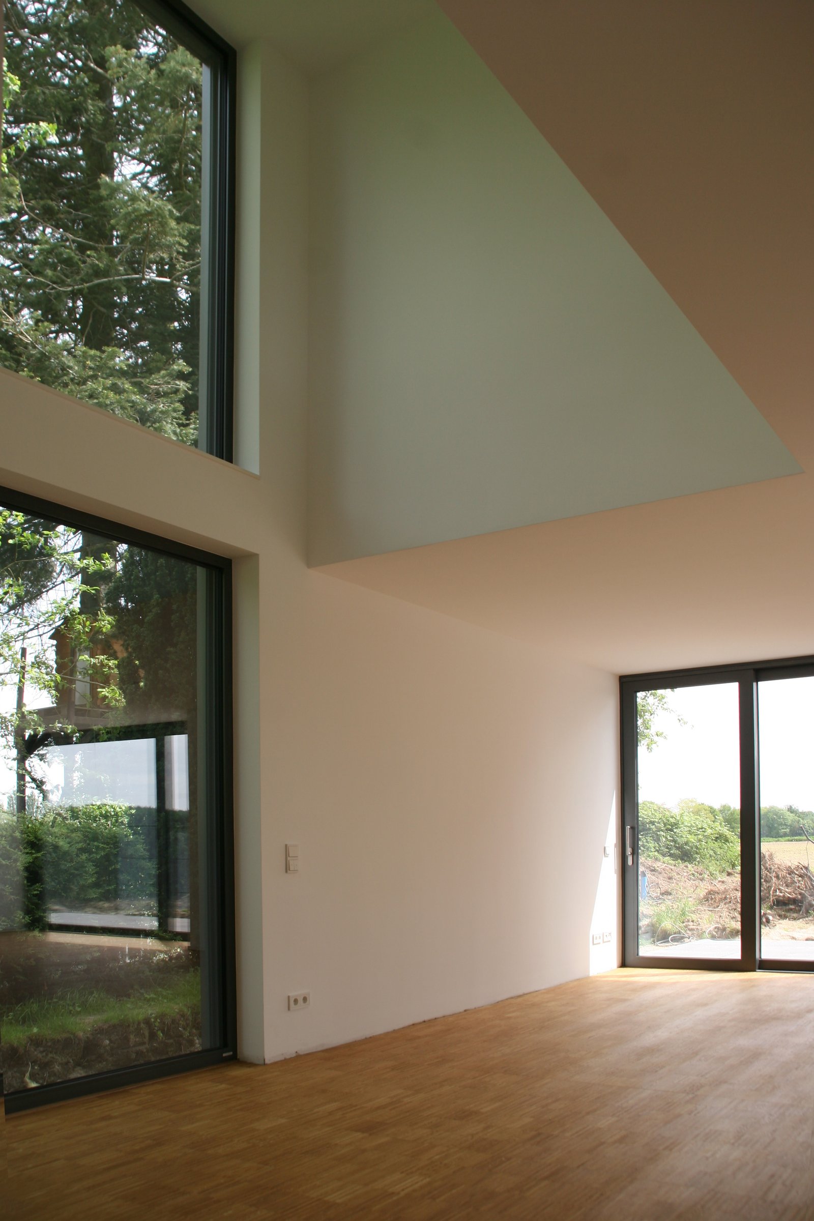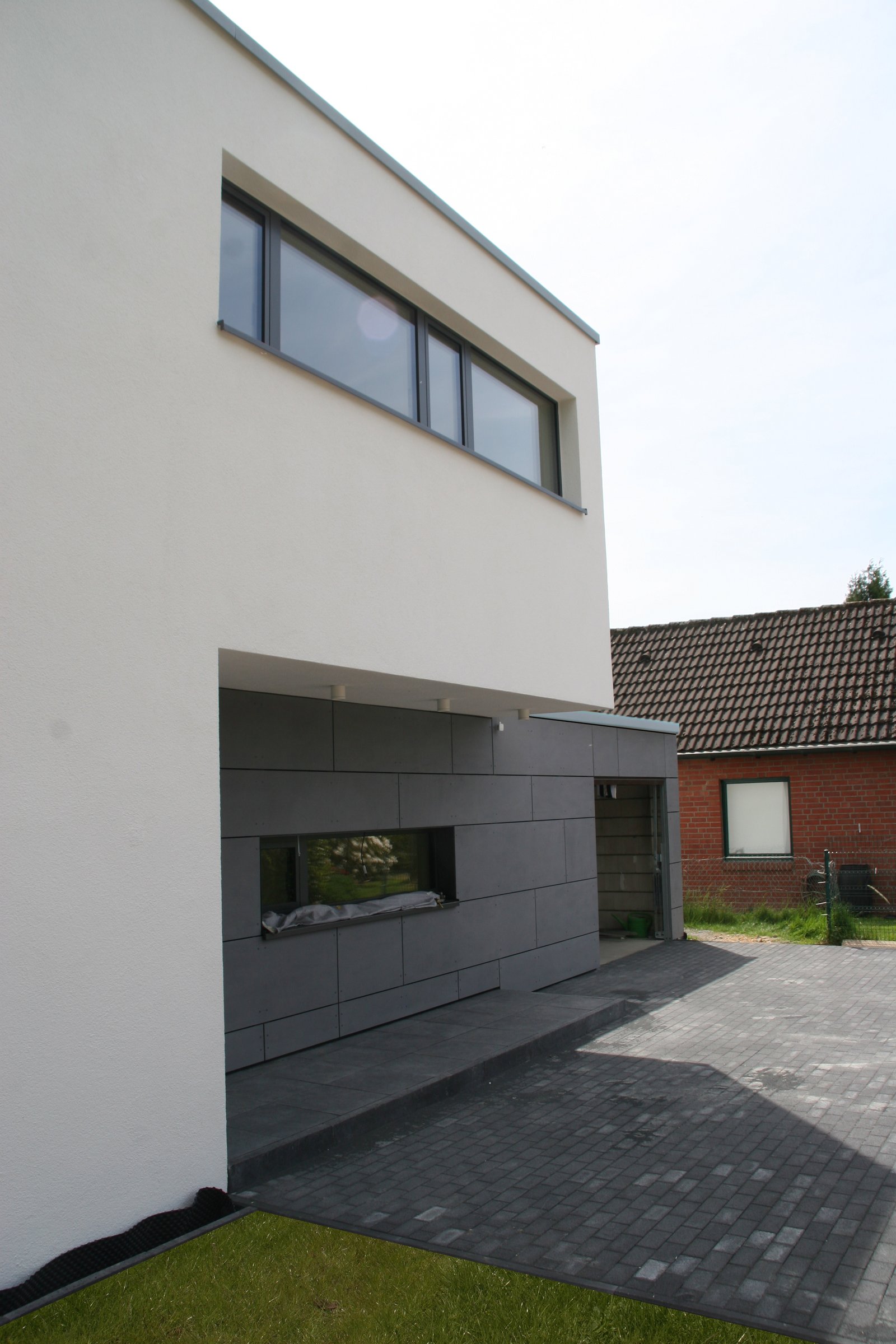 Das Gebäude ist zur Gartenseite hin ausgerichtet. Über großzügige Öffnungen auf zwei Ebenen ist der Blick frei auf die südlich an das Grundstück angrenzenden Felder. In einem eingeschossigen Nebenbaukörper befinden sich die Garage sowie die Technikräume.