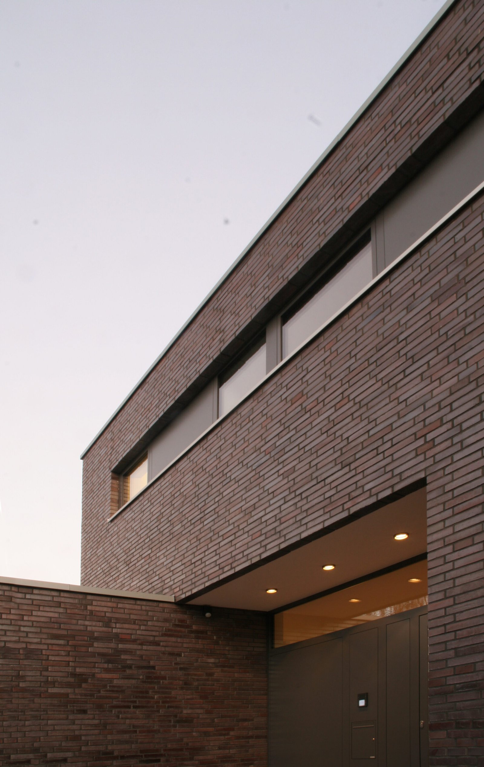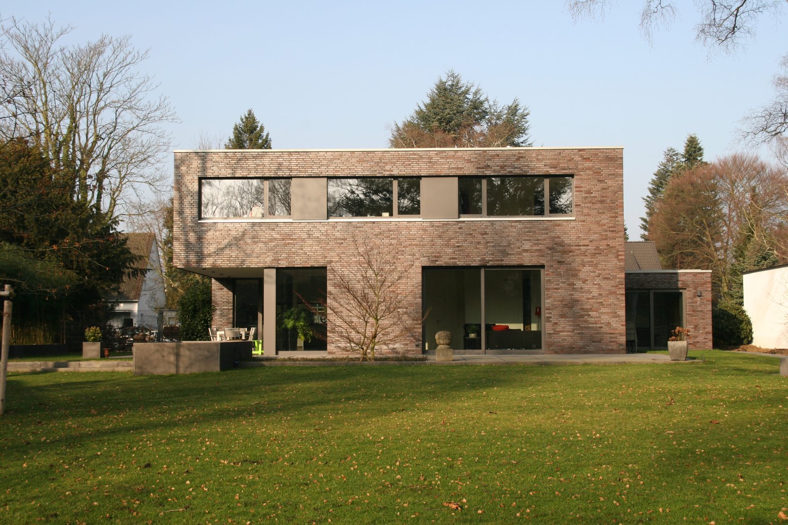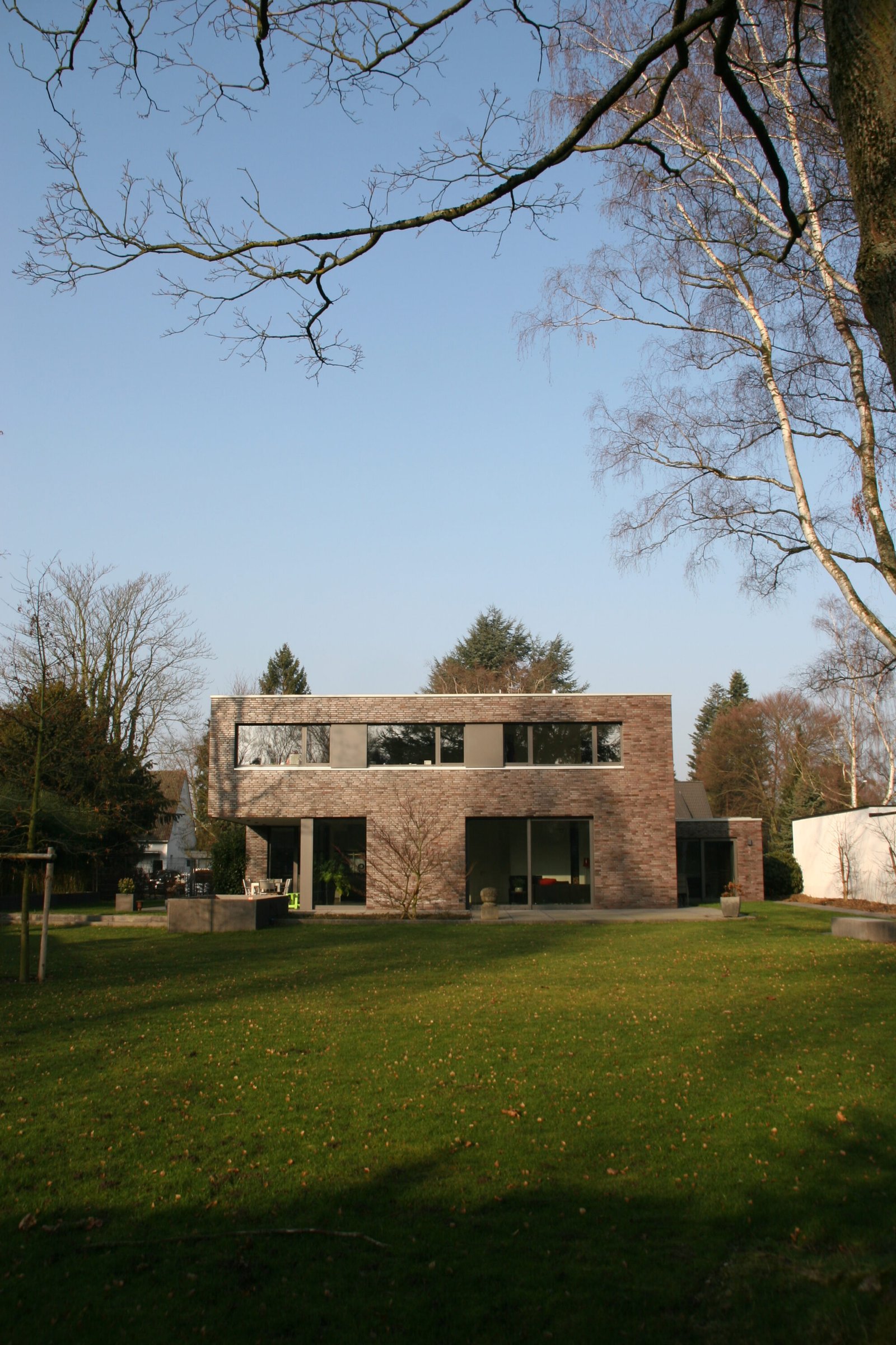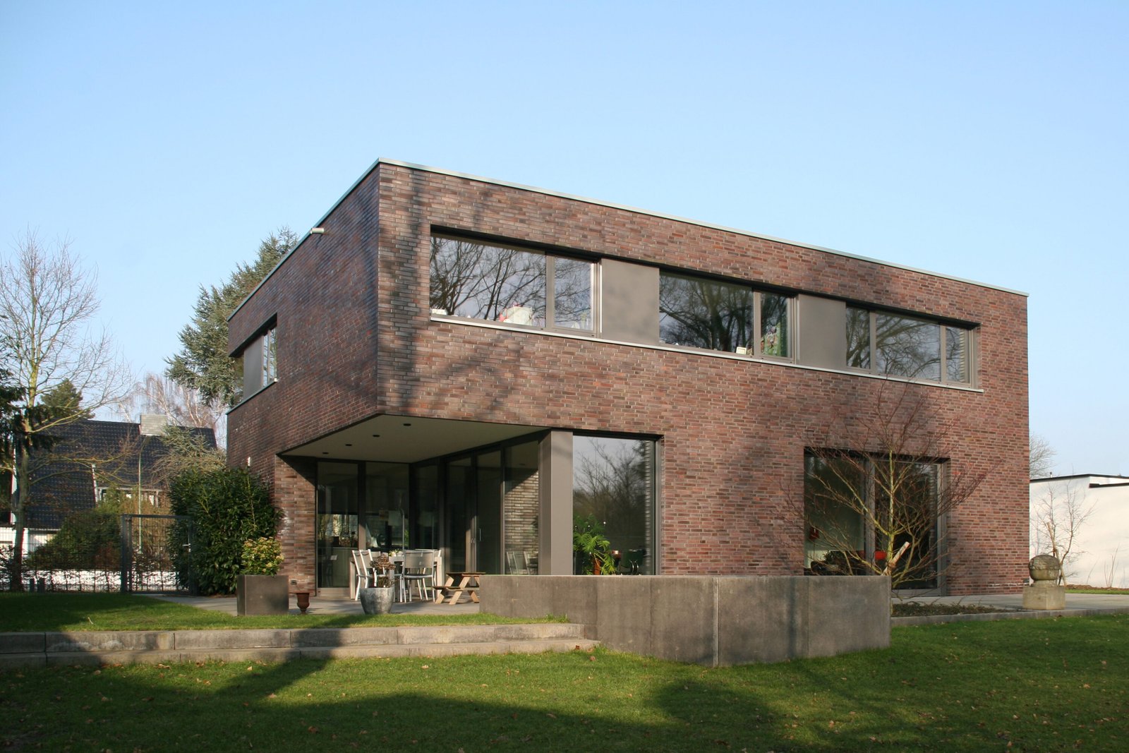 Nach Abriss eines Altbaus wurde auf dem nun freien Grundstück ein kubischer Neubau in der Tradition der klassischen Moderne errichtet. Dünnformatiges Ziegelmauerwerk unterstreicht seinen skulpturalen Charakter. Fensterbänder aus geschlossenen Aluminium-Blindpaneelen gliedern die Fassade. Durch den Vorsprung des Obergeschosses entsteht im Erdgeschoss ein überdachter Freisitz. Der Hauseingang an der Nordwestfassade wird wiederum durch einen Rücksprung des Erdgeschosses überdacht.