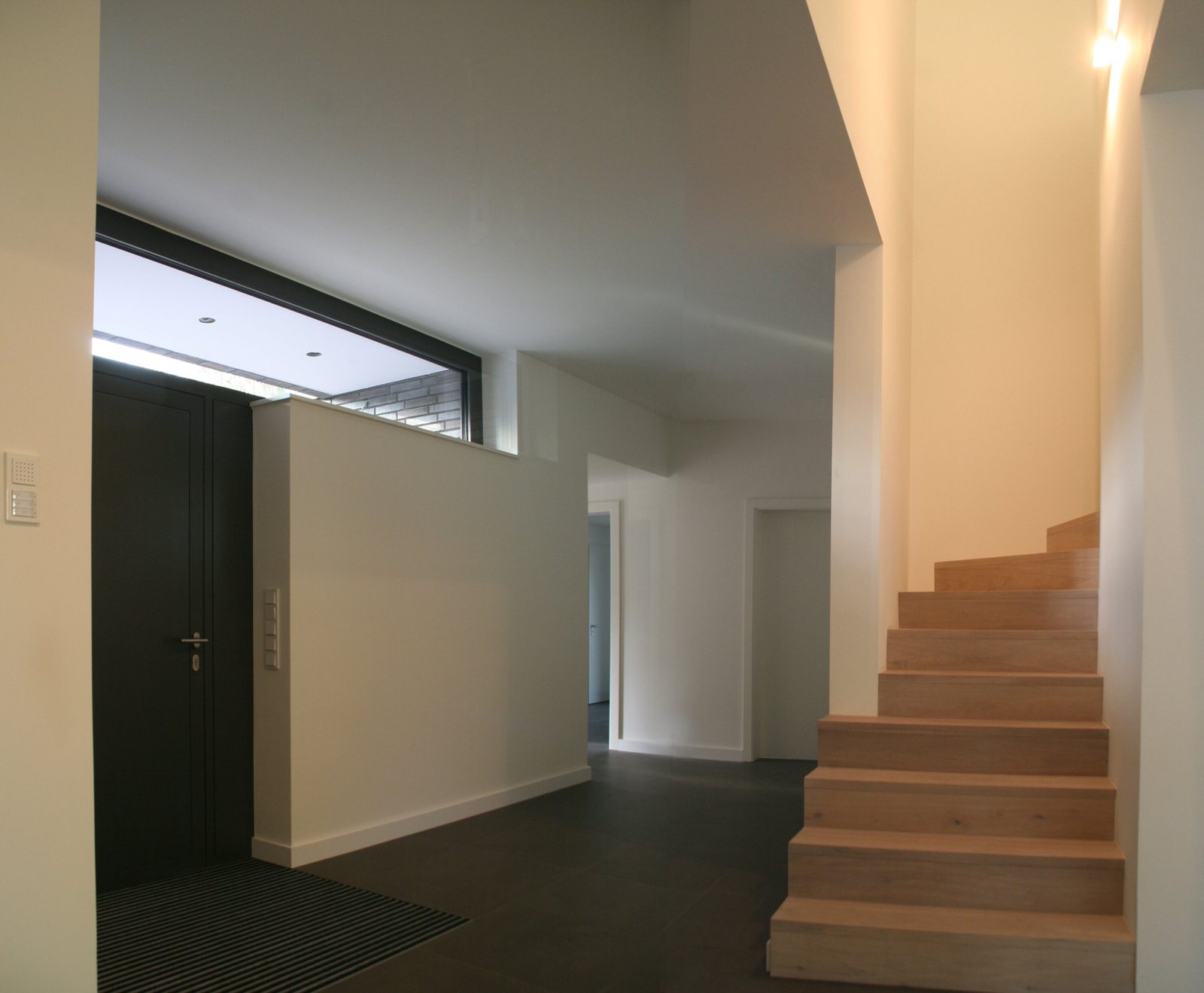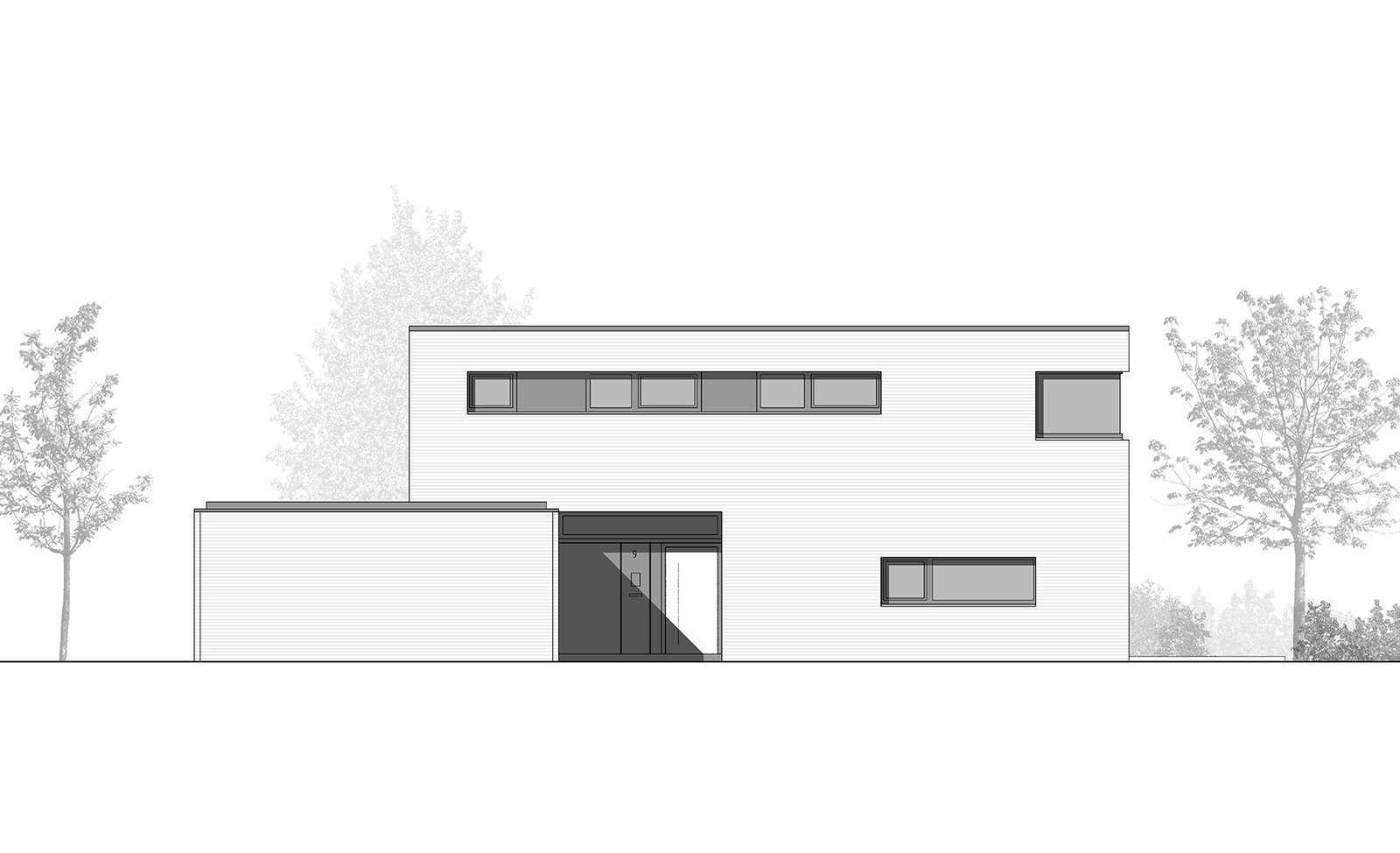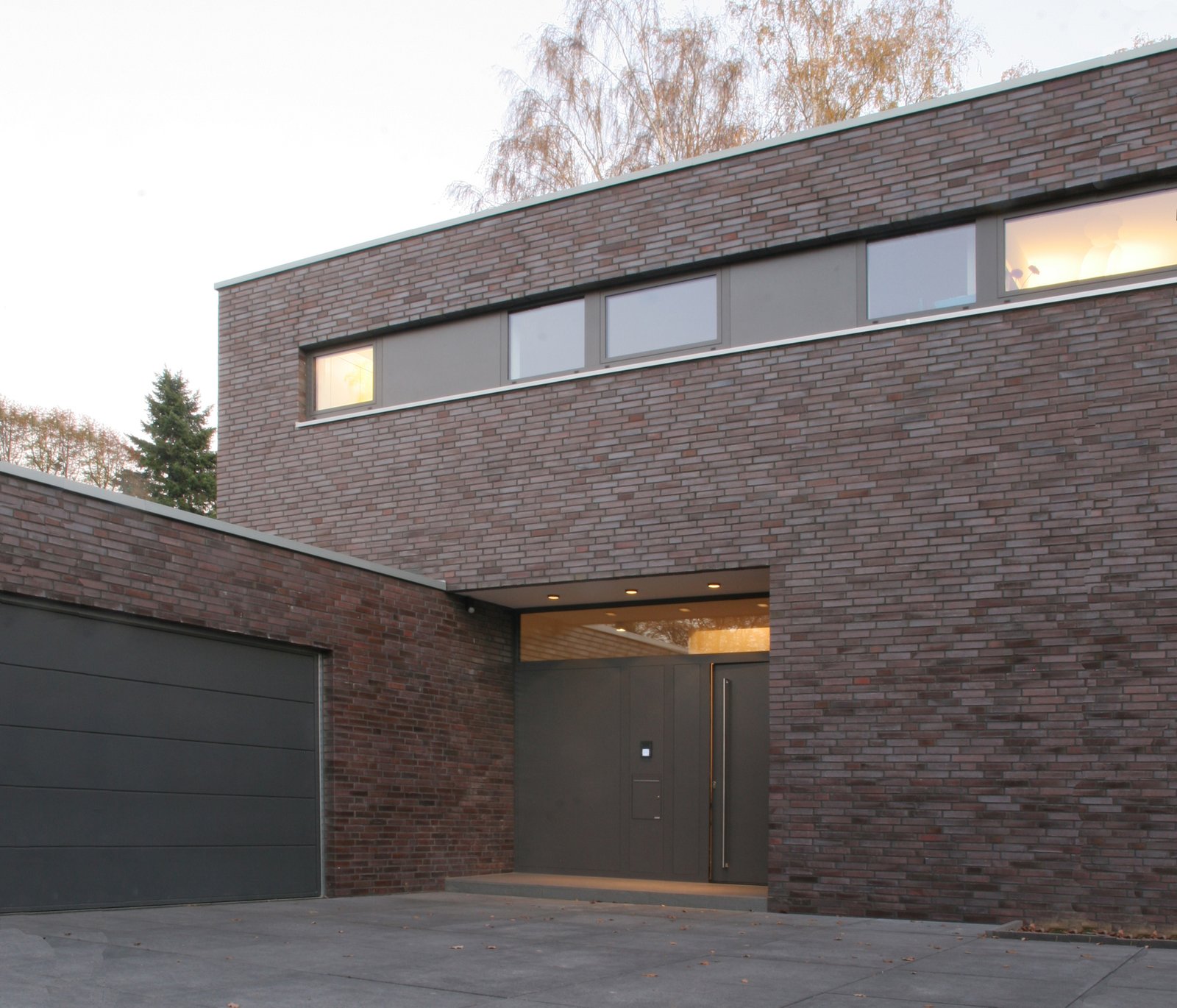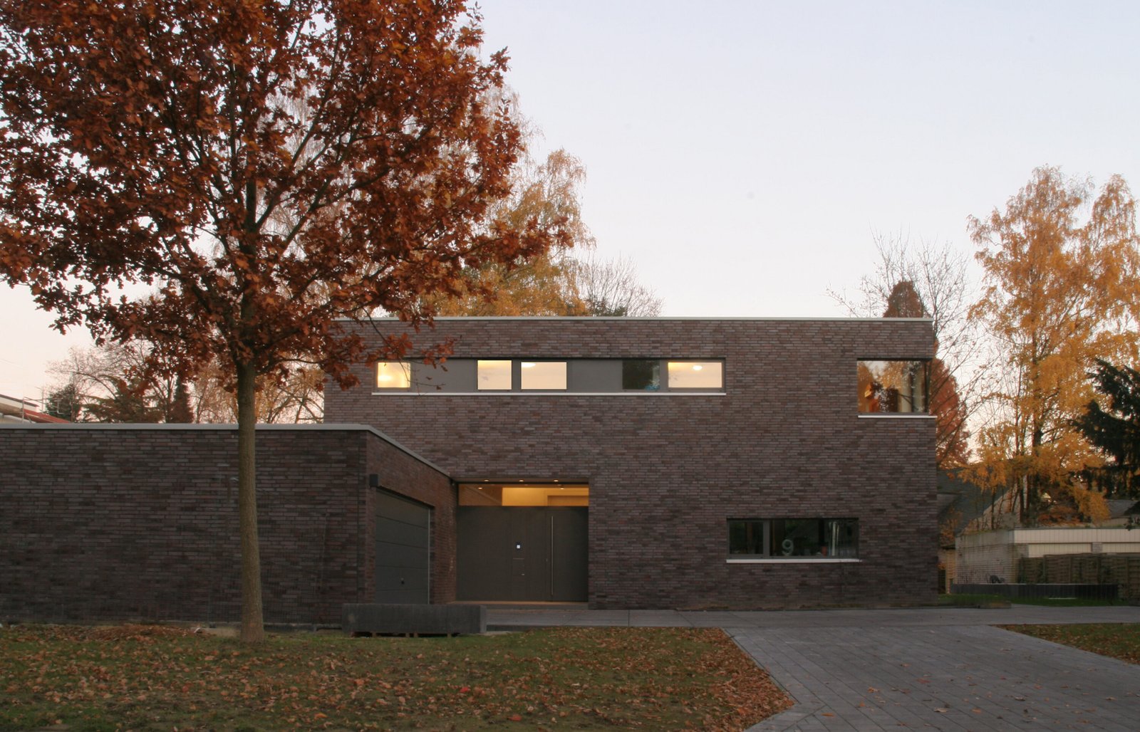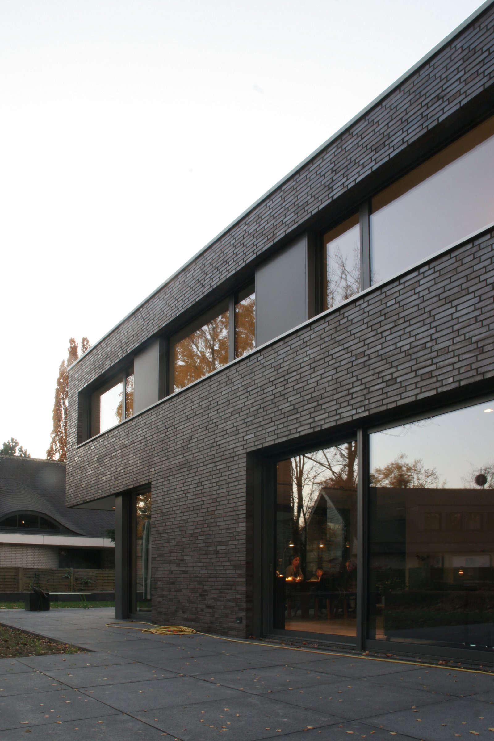 Nach Abriss eines Altbaus wurde auf dem nun freien Grundstück ein kubischer Neubau in der Tradition der klassischen Moderne errichtet. Dünnformatiges Ziegelmauerwerk unterstreicht seinen skulpturalen Charakter. Fensterbänder aus geschlossenen Aluminium-Blindpaneelen gliedern die Fassade. Durch den Vorsprung des Obergeschosses entsteht im Erdgeschoss ein überdachter Freisitz. Der Hauseingang an der Nordwestfassade wird wiederum durch einen Rücksprung des Erdgeschosses überdacht.