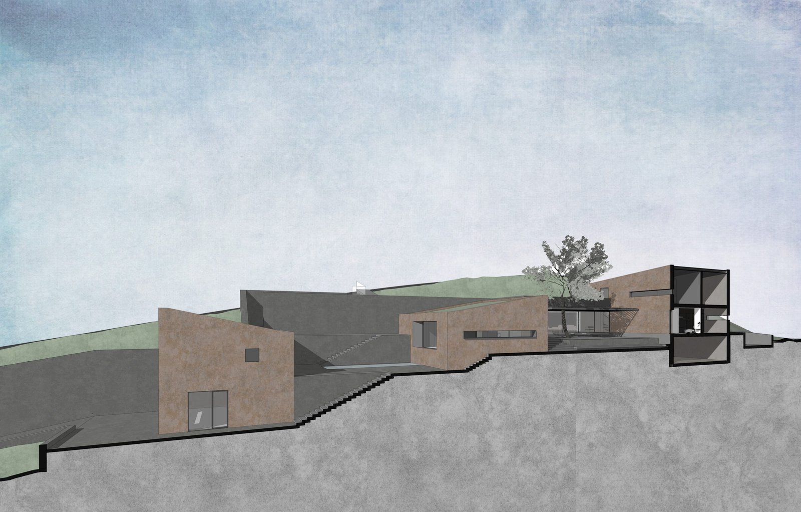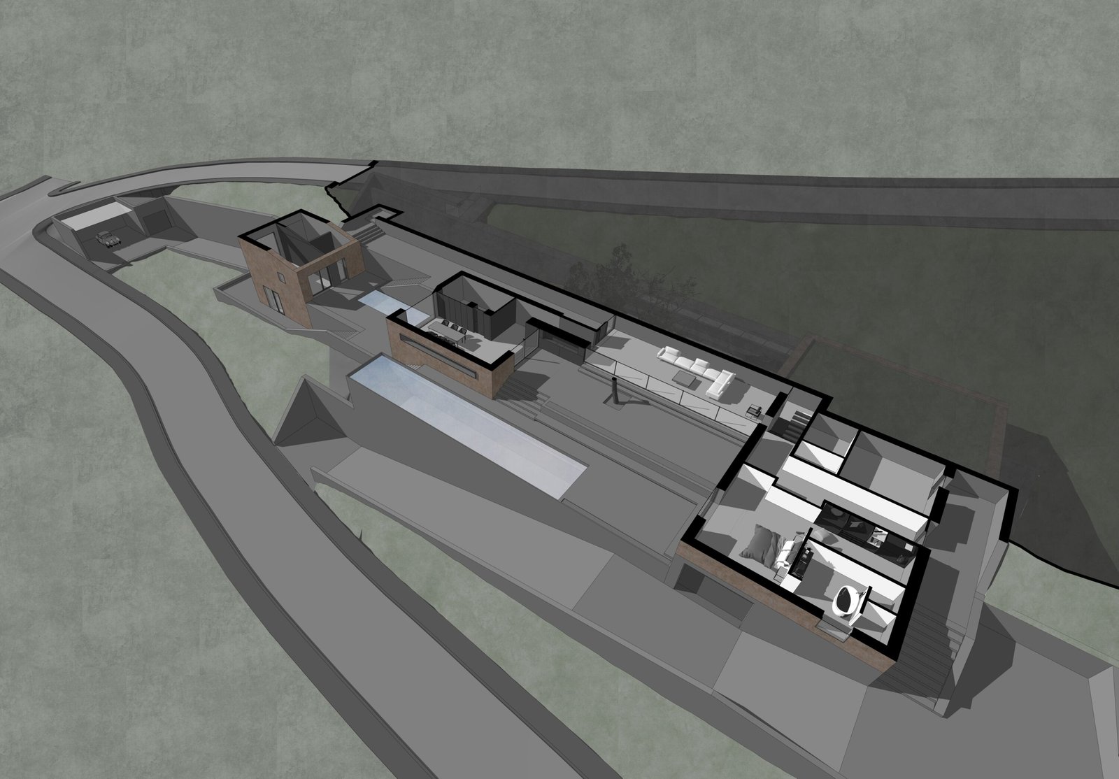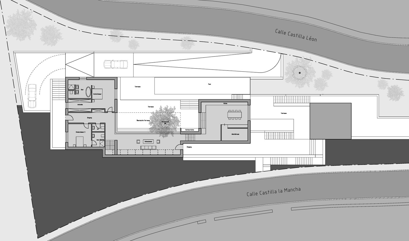 Der Neubau eines Ferienhauses auf einem Hanggrundstück in Andalusien nutzt die besondere Topografie für eine innovative Gestaltung. Zwischen zwei Straßen gelegen, weist das Grundstück einen Höhenunterschied von mehr als 15 Metern auf, der durch eine Terrassierung geschickt ausgeglichen wird. Drei einzelne Baukörper fügen sich in die Terrassenstruktur ein und sind durch großzügige Außenbereiche miteinander verbunden.
