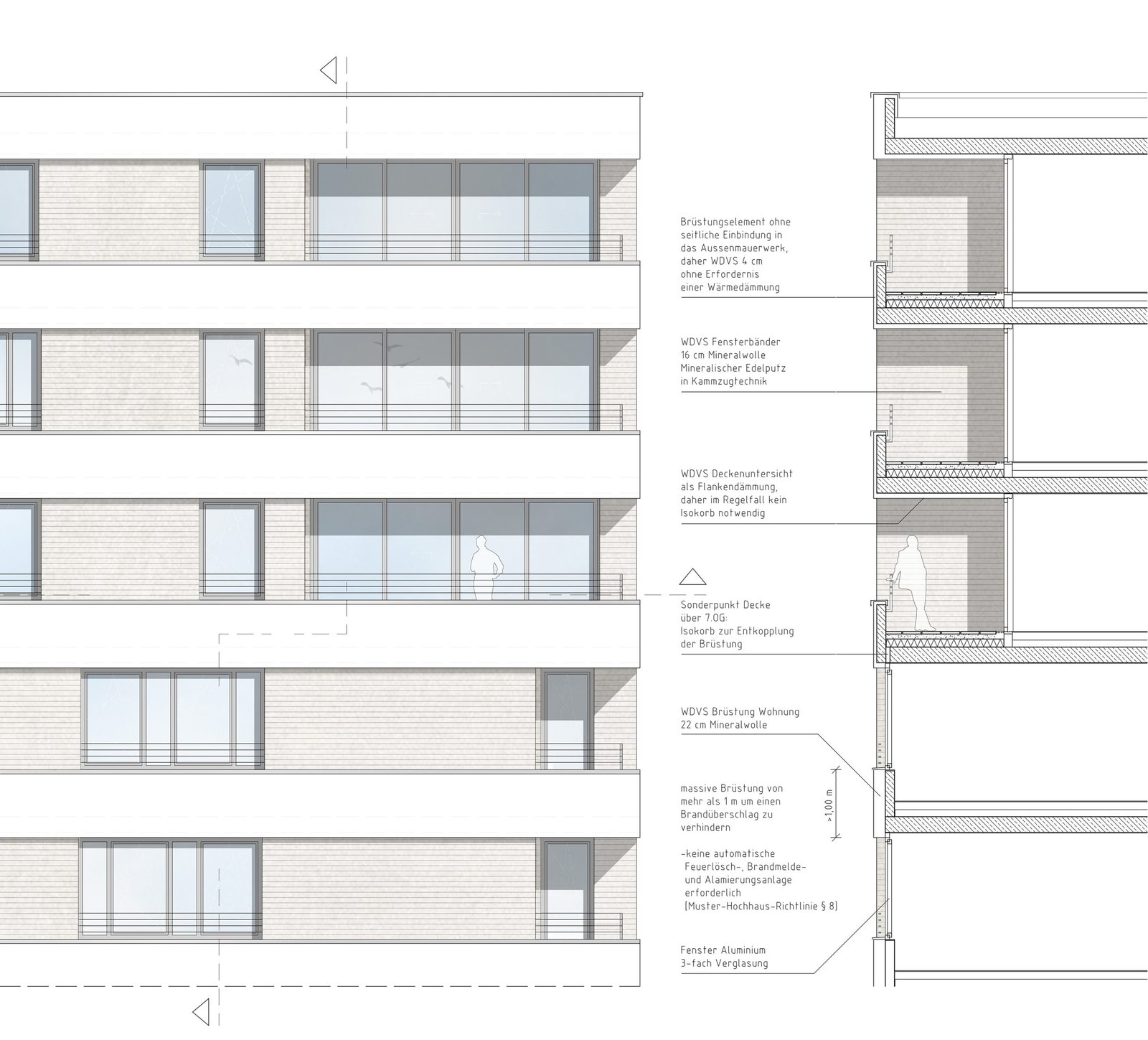 Die rückgestaffelten Loggien lockern die Geometrie der Brüstungsbänder auf und betonen die Gebäudekanten, insbesondere an der Westfassade. Das einheitliche Achssystem sorgt für geordnete Grundrisse und eine wirtschaftliche Bauweise.