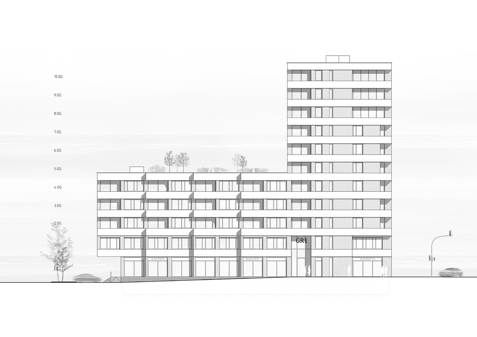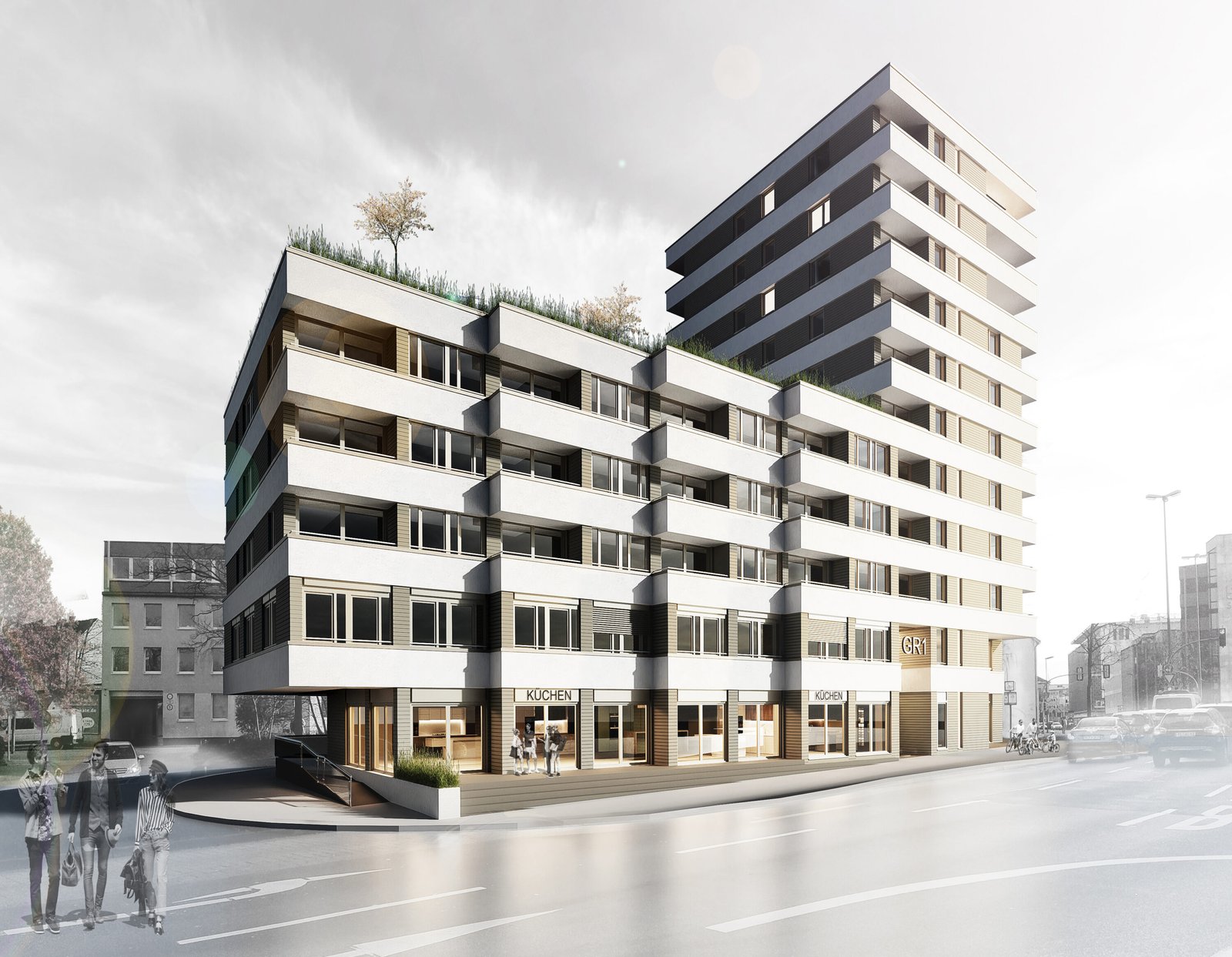 Die Zonierung des Gebäudes ist klar ablesbar: Geschäfts- und Büroflächen im Erdgeschoss und 1. Obergeschoss, gefolgt von Einzimmer-Appartements mit Loggien in den oberen Stockwerken. In den obersten Etagen bieten größere Wohnungen entsprechend großzügige Balkone.