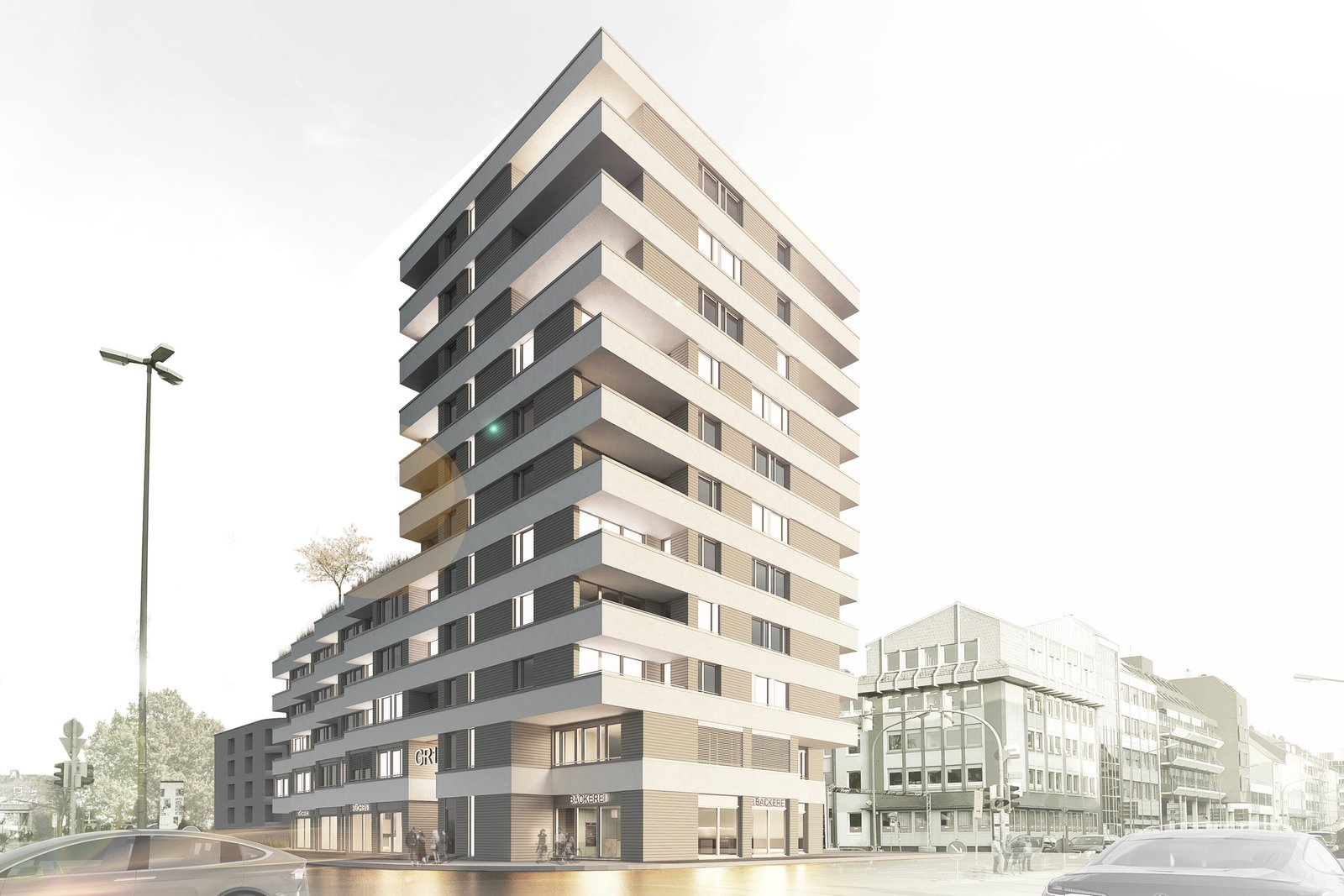 Unser Fassadenentwurf verbindet einheitliche Gestaltung mit optimaler Funktionalität. Regelmäßige Brüstungsbänder und flexible Fensterbänder mit eingeschnittenen Loggien schaffen eine klare Struktur, die sich den unterschiedlichen Wohnungszuschnitten anpasst. Diese Gestaltung sorgt für optimale Belichtung und großzügige Freibereiche.