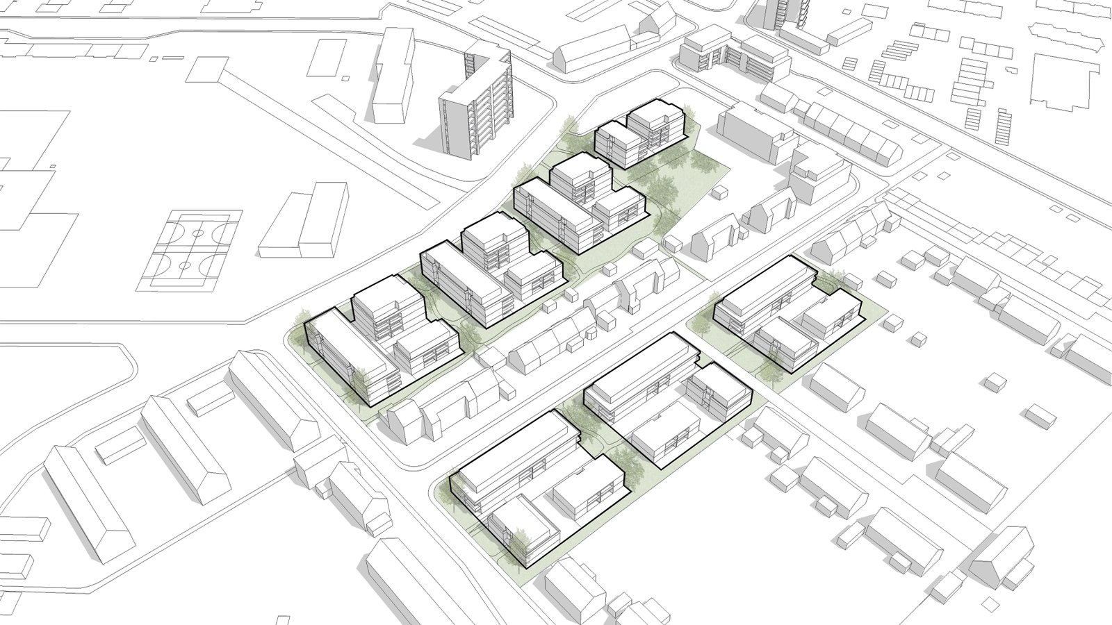 Unser Entwurf für das neue Wohnquartier greift die bestehende, heterogene Umgebung auf und vermittelt geschickt zwischen Zeilenbebauung der 1950er Jahre und modernen Solitärgebäuden. Durch die alternierende Anordnung beider Bauformen entsteht ein harmonischer Übergang zwischen den unterschiedlichen Strukturen der Nachbarschaft.