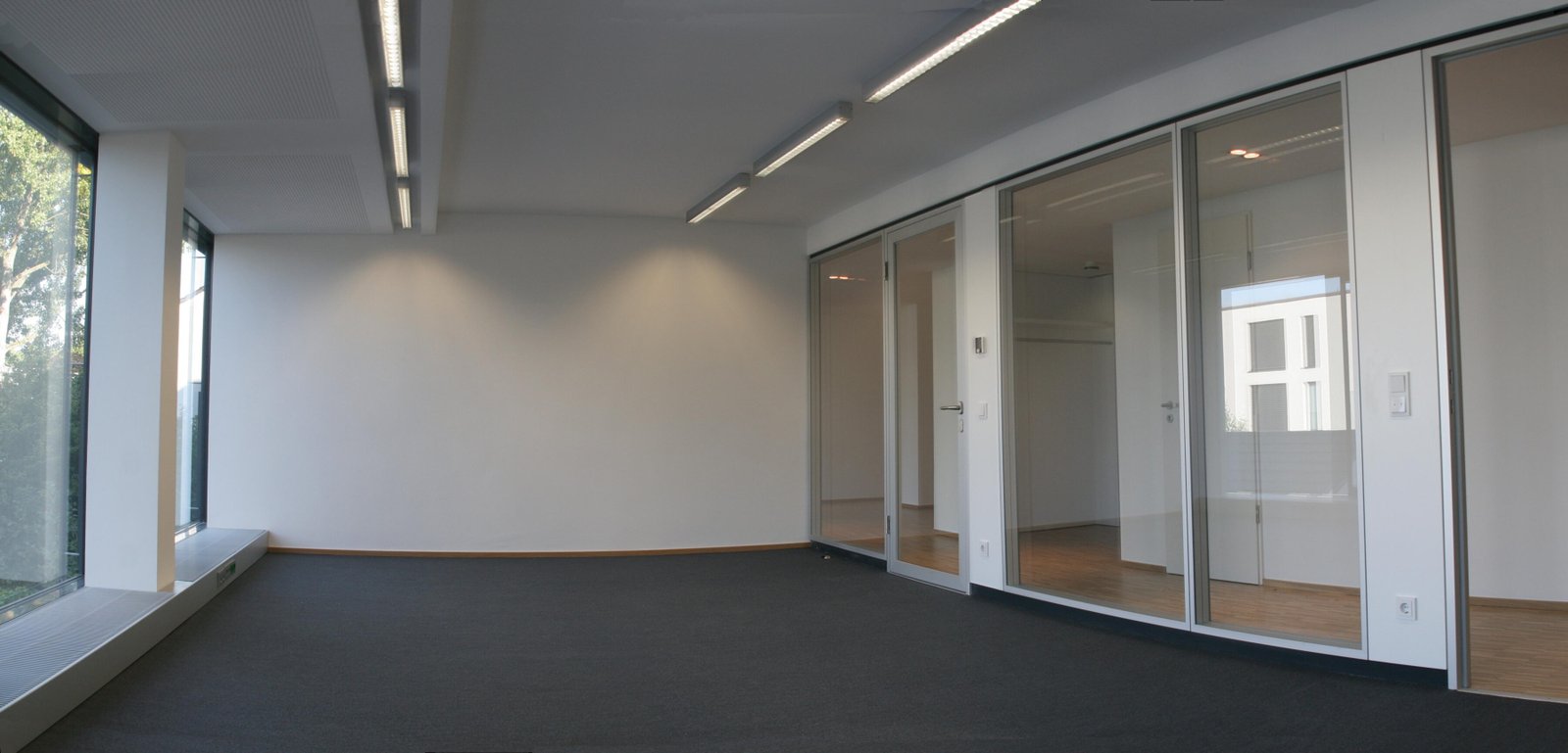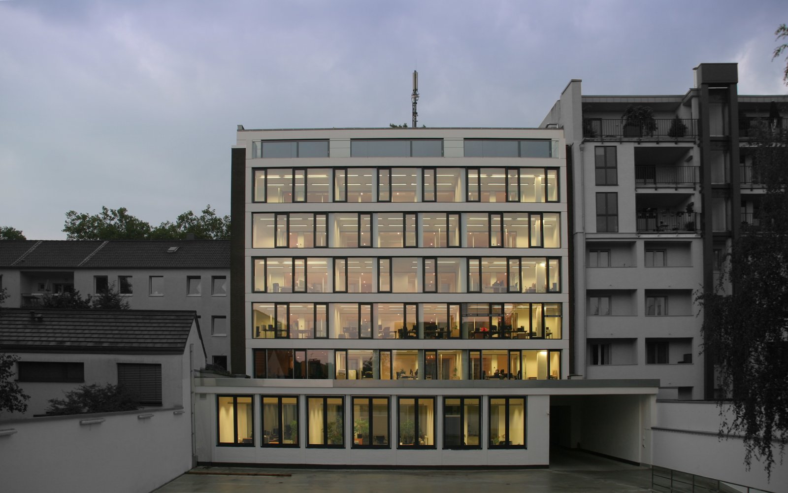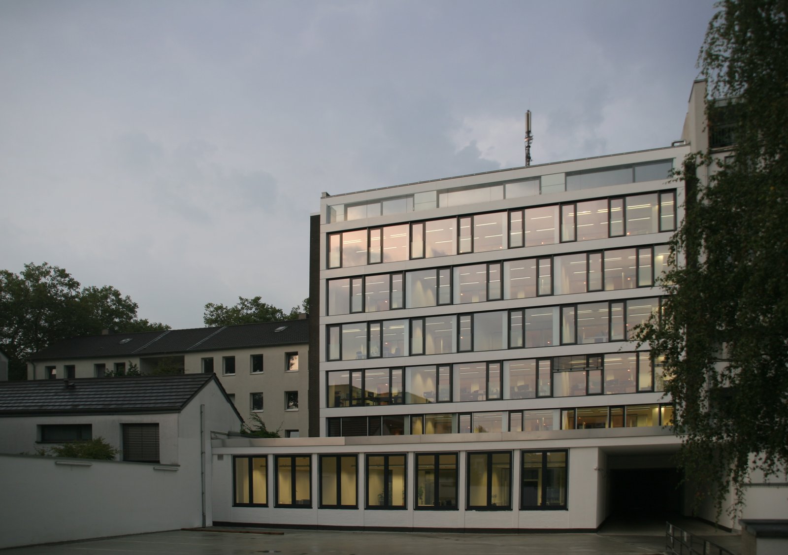 Nach dem Rückbau der vorhandenen Waschbetonfassade wurde die ehemals tragende Außenwand des Gebäudes über ein neues Stahltragwerk abgefangen. Diese Maßnahme ermöglichte den Einbau einer bodentief verglasten Fassade, die den Innenraum erhellt. Verglaste Flurwände lassen das Licht bis in das Gebäudeinnere strahlen. Zusätzlich wurde der gesamte Grundriss offener organisiert.