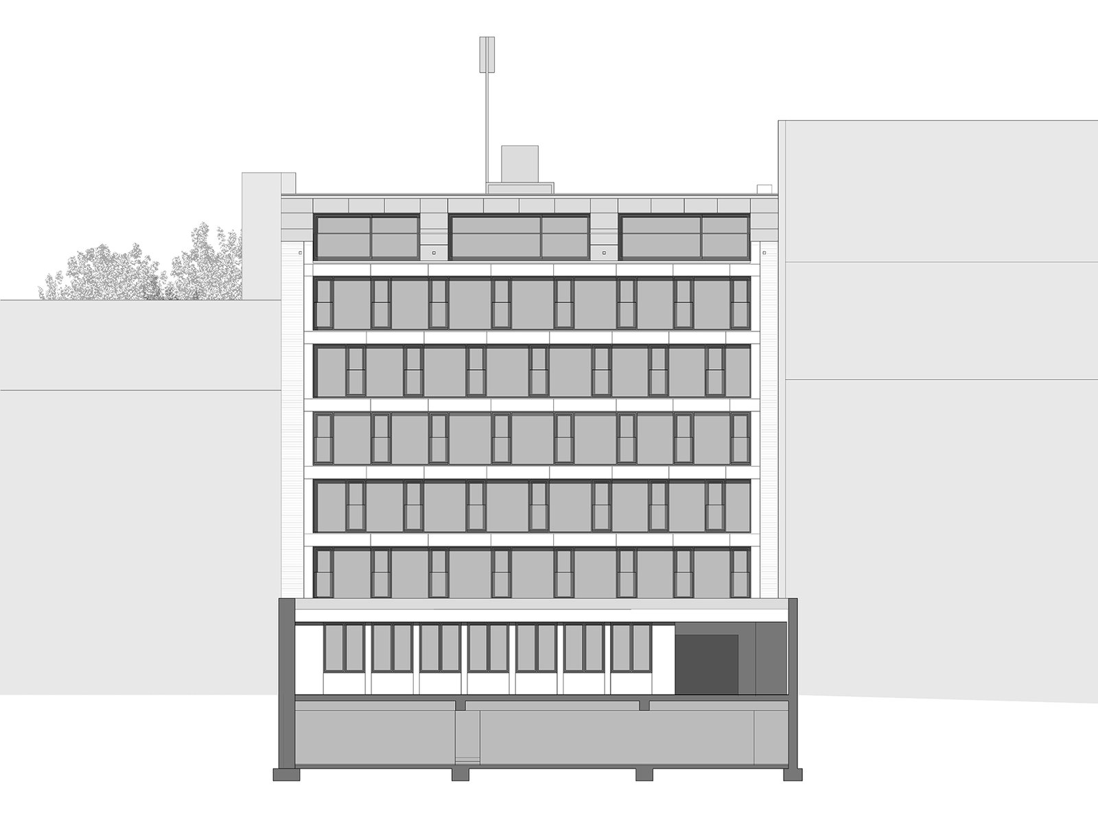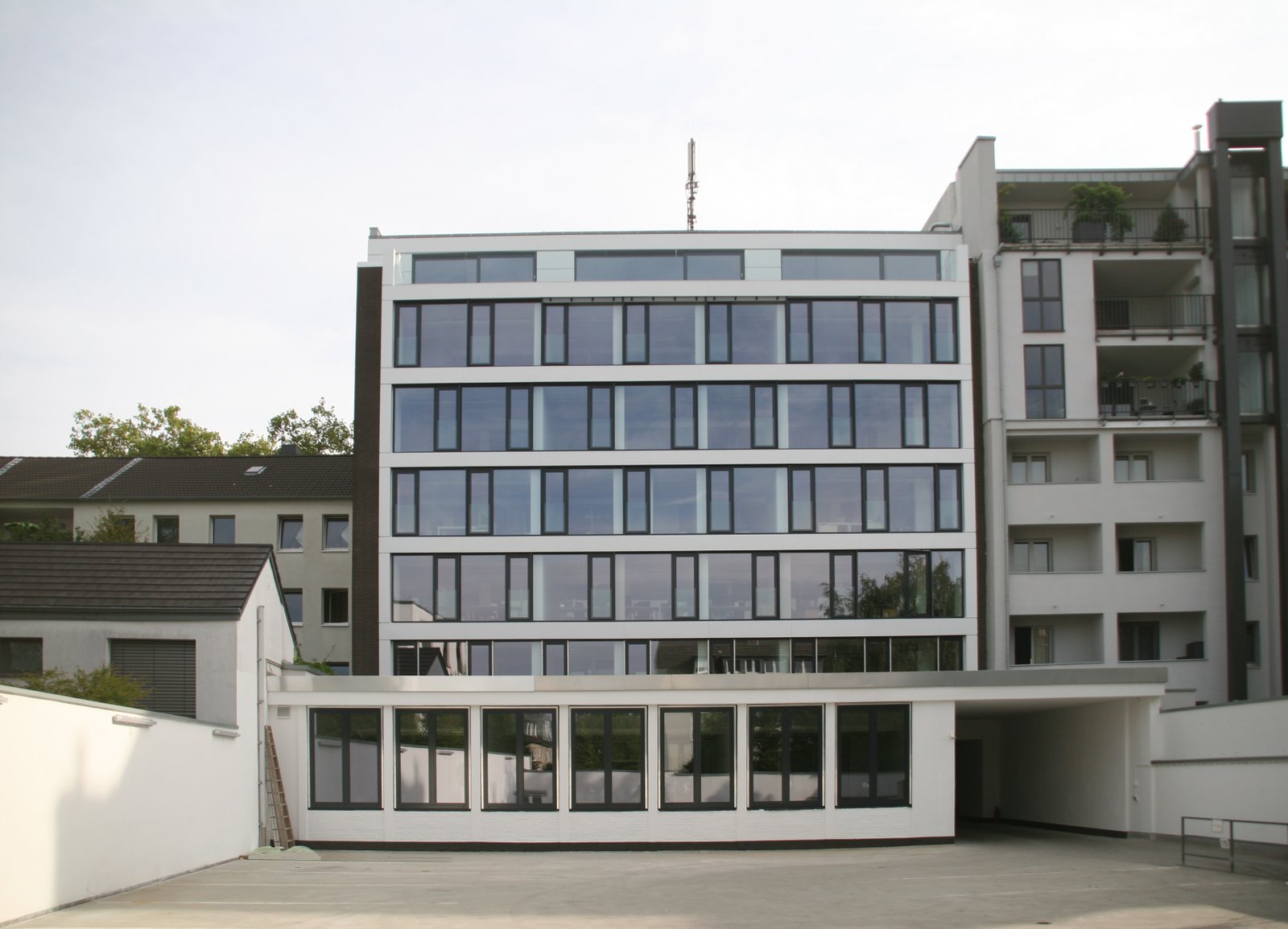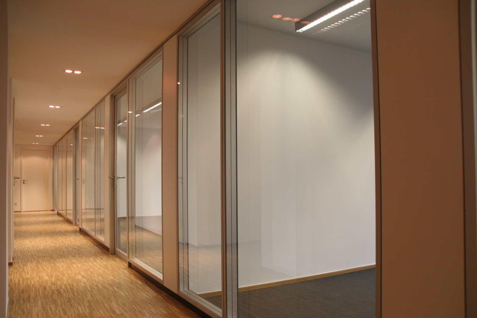 Nach dem Rückbau der vorhandenen Waschbetonfassade wurde die ehemals tragende Außenwand des Gebäudes über ein neues Stahltragwerk abgefangen. Diese Maßnahme ermöglichte den Einbau einer bodentief verglasten Fassade, die den Innenraum erhellt. Verglaste Flurwände lassen das Licht bis in das Gebäudeinnere strahlen. Zusätzlich wurde der gesamte Grundriss offener organisiert.