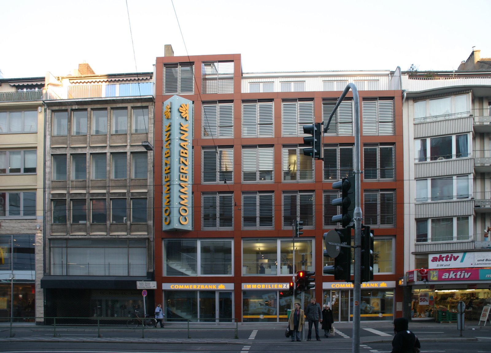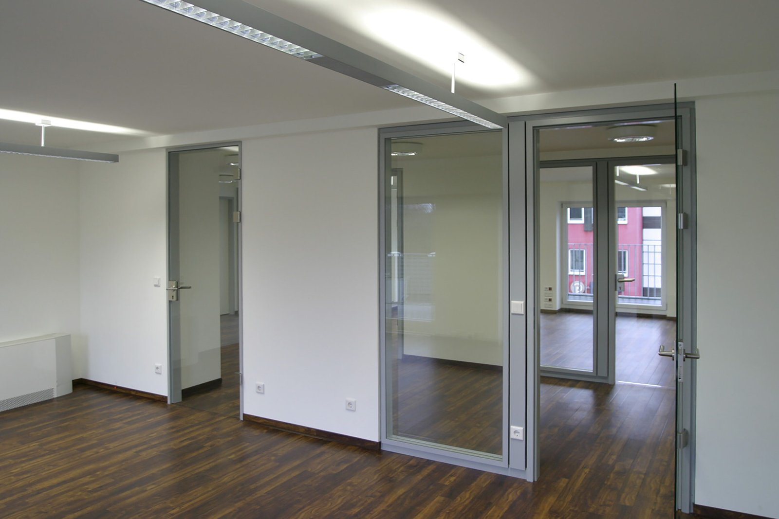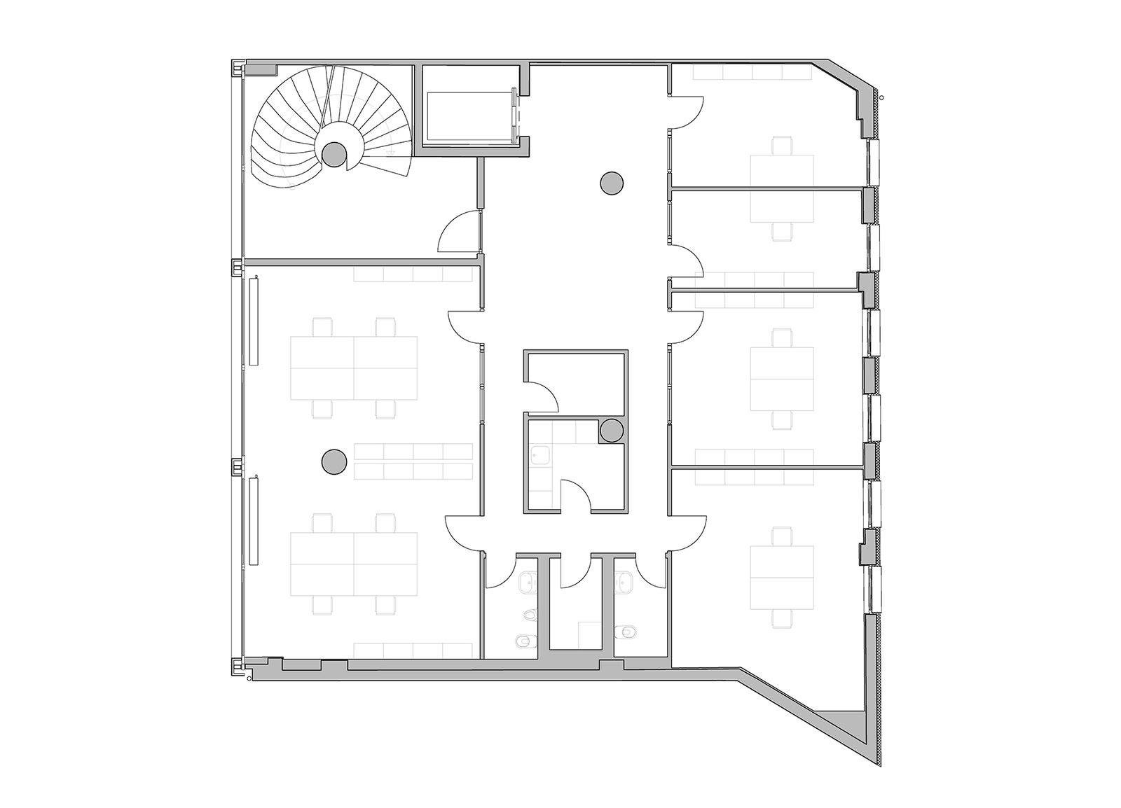 Das Bürogebäude aus den 1950er-Jahrenwurde vollständig saniert und neu organisiert. Die Innenräume erhielten eine offene Struktur mit einer breiten, lichtdurchfluteten Innenzone, die durch Glaswände belichtet wird. Diese Innenzone nimmt dienende Räume wie WCs, Teeküchen, Technikräume und Lager auf, während die Büros entlang der Fassade positioniert sind.