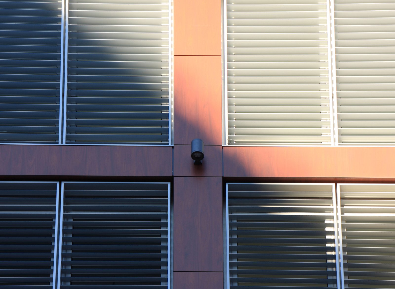 Eine neue hinterlüftete Fassade aus Melaminharztafeln mit Holzfurnier ermöglichte die nachträgliche Wärmedämmung des Gebäudes. Aluminiumlamellen vor den Fenstern dienen als Sonnenschutz. Diese Kombination verbindet eine warme Materialästhetik mit funktionalem Schutz und erfüllt moderne Anforderungen an Raumgestaltung und Nutzung.