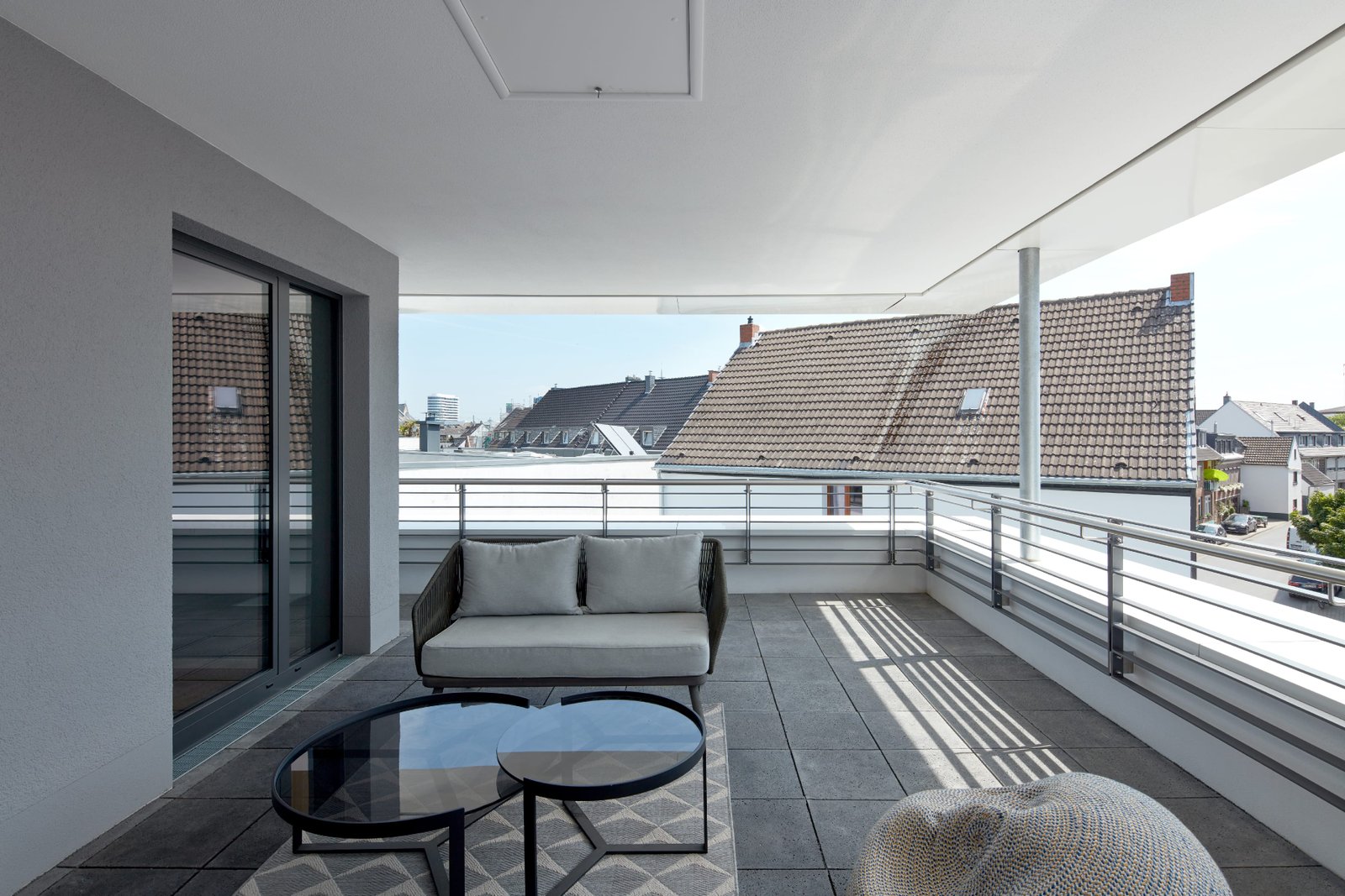 Das Staffelgeschoss bietet mit einer Dachterrasse einen zusätzlichen Außenraum mit Blick über das umgebende Stadtviertel. Die mit Aluminiumtafeln verkleidete Dachkonstruktion bietet für den Freisitz einen Witterungsschutz und trägt zur modernen Gestaltung des Umbaus bei.